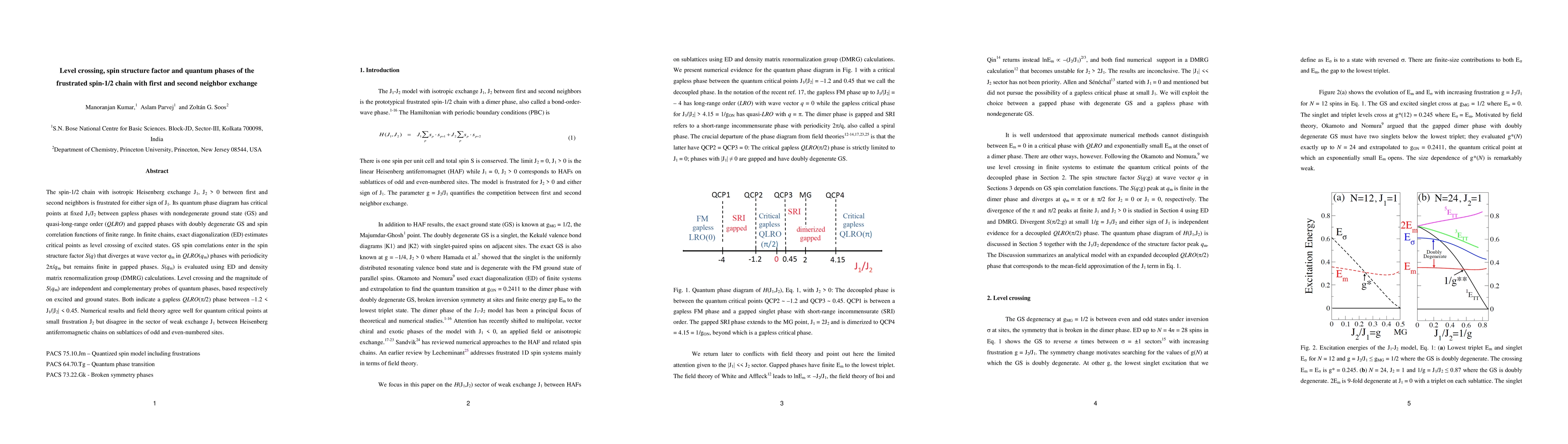 The spin-1/2 chain with isotropic Heisenberg exchange $J_1$, $J_2 > 0$ between first and second neighbors is frustrated for either sign of J1. Its quantum phase diagram has critical points at fixed $J_1/J_2$ between gapless phases with nondegenerate ground state (GS) and quasi-long-range order (QLRO) and gapped phases with doubly degenerate GS and spin correlation functions of finite range. In finite chains, exact diagonalization (ED) estimates critical points as level crossing of excited states. GS spin correlations enter in the spin structure factor $S(q)$ that diverges at wave vector $q_m$ in QLRO($q_m$) phases with periodicity $2\pi/q_m$ but remains finite in gapped phases. $S(q_m)$ is evaluated using ED and density matrix renormalization group (DMRG) calculations. Level crossing and the magnitude of $S(q_m)$ are independent and complementary probes of quantum phases, based respectively on excited and ground states. Both indicate a gapless QLRO($\pi/2$) phase between $-1.2 < J_1/|J_2| < 0.45$. Numerical results and field theory agree well for quantum critical points at small frustration $J_2$ but disagree in the sector of weak exchange $J_1$ between Heisenberg antiferromagnetic chains on sublattices of odd and even-numbered sites.
