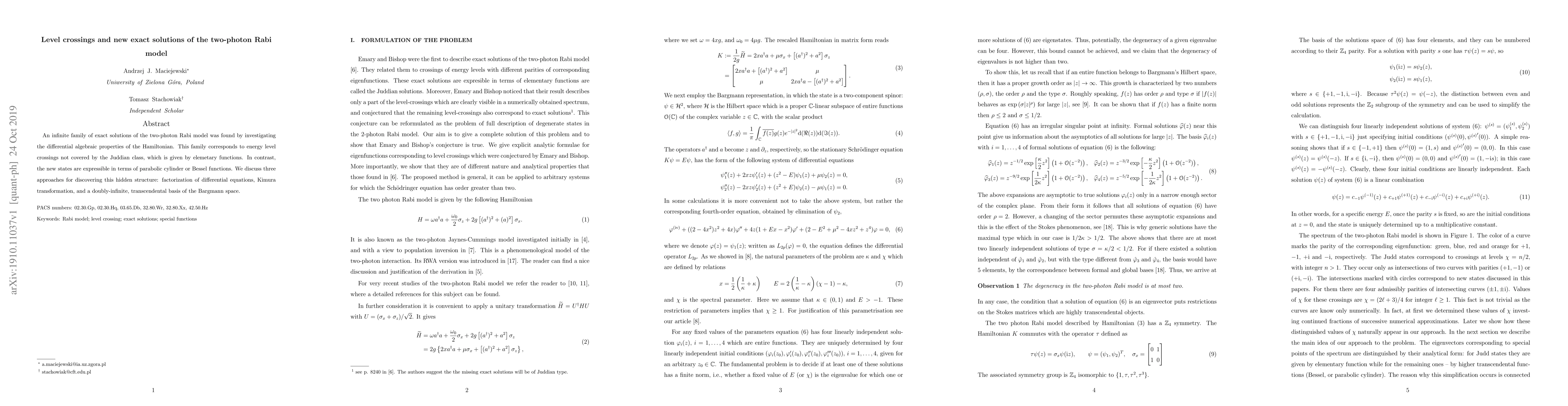 An infinite family of exact solutions of the two-photon Rabi model was found by investigating the differential algebraic properties of the Hamiltonian. This family corresponds to energy level crossings not covered by the Juddian class, which is given by elemetary functions. In contrast, the new states are expressible in terms of parabolic cylinder or Bessel functions. We discuss three approaches for discovering this hidden structure: factorization of differential equations, Kimura transformation, and a doubly-infinite, transcendental basis of the Bargmann space.