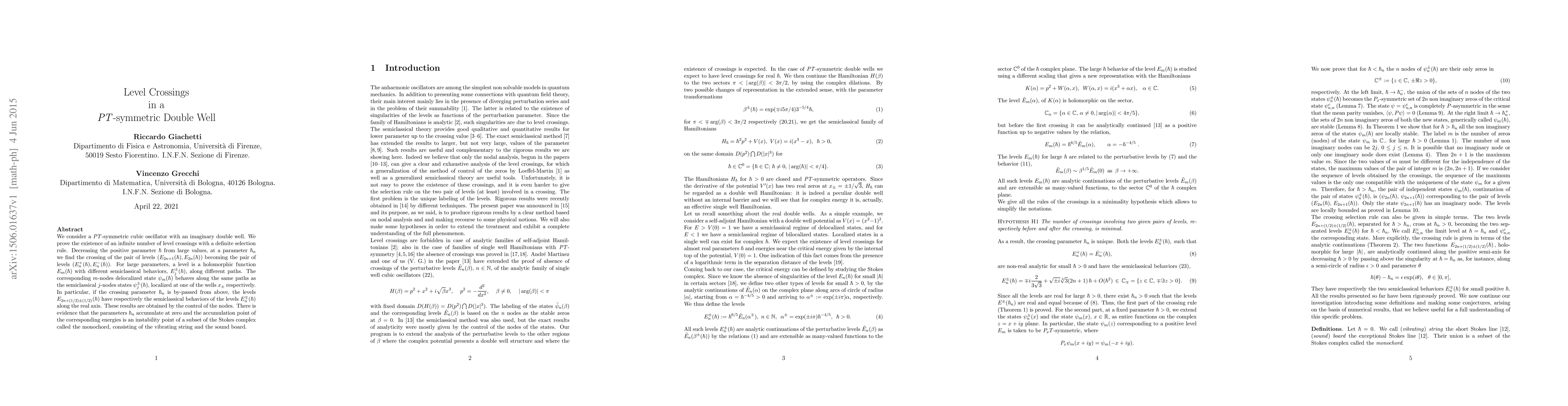 We consider a \textit{PT}-symmetric cubic oscillator with an imaginary double well. We prove the existence of an infinite number of level crossings with a definite selection rule. Decreasing the positive parameter $\hbar$ from large values, at a value $\hbar_n$ we find the crossing of the pair of levels $(E_{2n+1}(\hbar),E_{2n}(\hbar))$ becoming the pair of levels $(E_n^+(\hbar),E_n^-(\hbar))$. For large parameters, a level is a holomorphic function $E_m(\hbar)$ with different semiclassical behaviors, $E_j^\pm(\hbar),$ along different paths. The corresponding $m$-nodes delocalized state $\psi_m(\hbar)$ behaves along the same paths as the semiclassical $j$-nodes states $\psi_j^\pm(\hbar),$ localized at one of the wells $x_\pm$ respectively. In particular, if the crossing parameter $\hbar_n$ is by-passed from above, the levels $E_{2n+(1/2)\pm(1/2)}(\hbar)$ have respectively the semiclassical behaviors of the levels $E_n^\mp(\hbar)$ along the real axis. These results are obtained by the control of the nodes. There is evidence that the parameters $\hbar_n$ accumulate at zero and the accumulation point of the corresponding energies is aninstability point of a subset of the Stokes complex called the monochord, consisting of the vibrating string and the sound board.