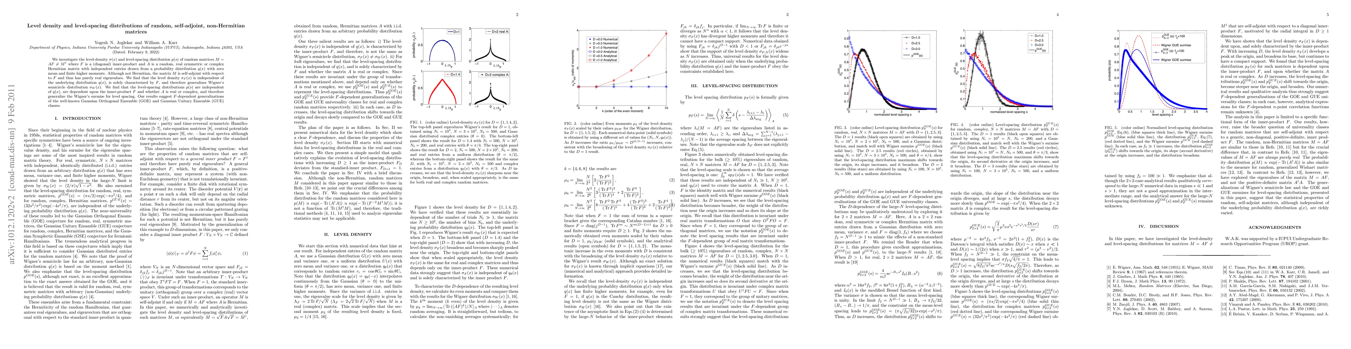 This paper explores the level density and level-spacing distributions of random, self-adjoint, non-Hermitian matrices, finding that these distributions are independent of the underlying matrix entries' distribution and are instead characterized by the inner-product used, generalizing Wigner's semicircle and surmise.