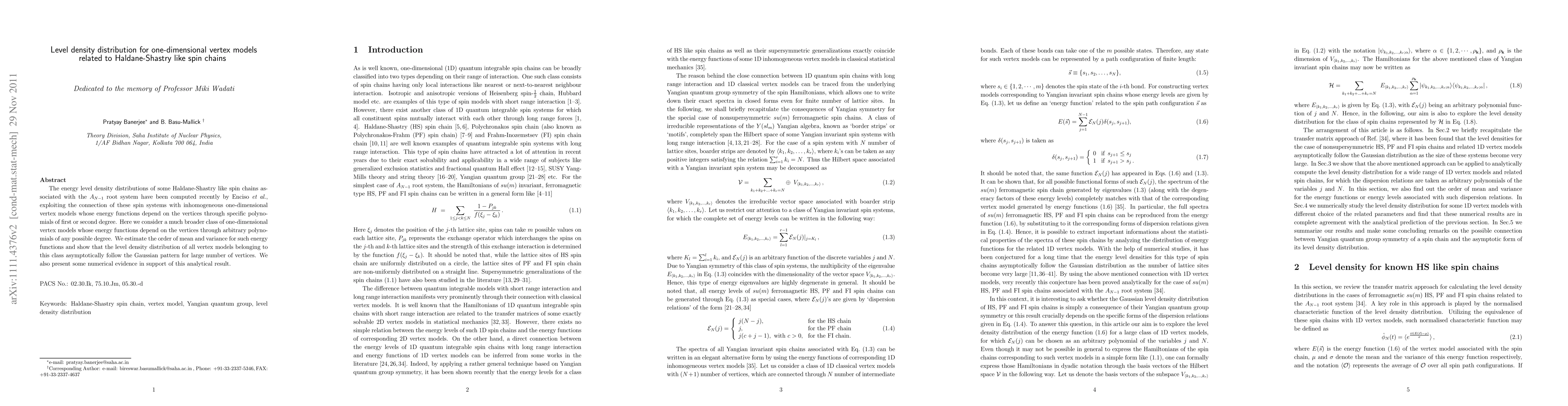 This paper investigates the level density distribution for a wide range of one-dimensional vertex models linked to Haldane-Shastry spin chains. It demonstrates that these models, whose energy functions depend on vertices through arbitrary polynomial degrees, asymptotically follow a Gaussian pattern as the number of vertices increases.