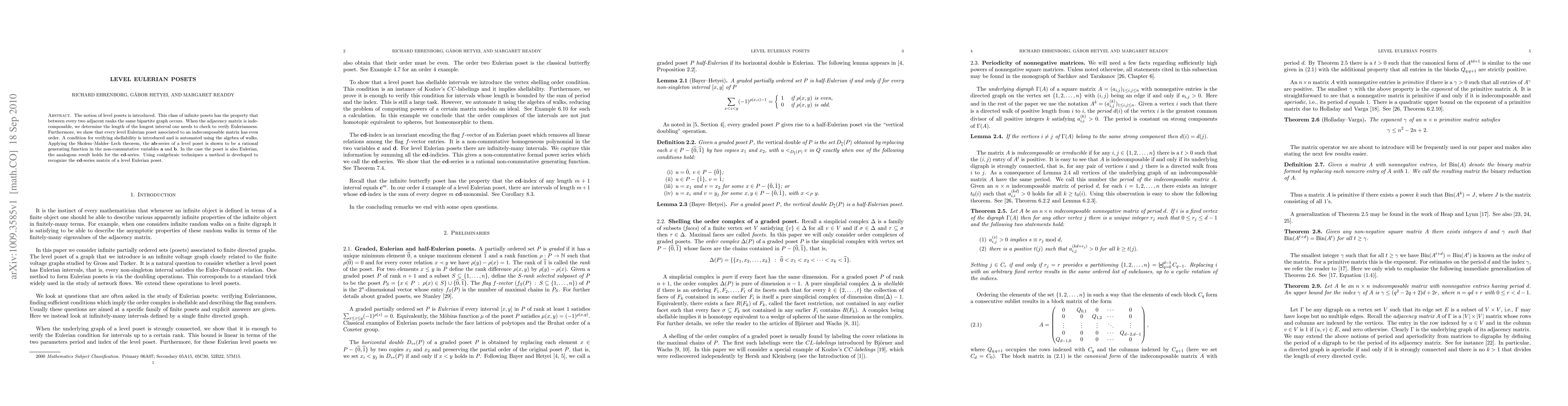 The notion of level posets is introduced. This class of infinite posets has the property that between every two adjacent ranks the same bipartite graph occurs. When the adjacency matrix is indecomposable, we determine the length of the longest interval one needs to check to verify Eulerianness. Furthermore, we show that every level Eulerian poset associated to an indecomposable matrix has even order. A condition for verifying shellability is introduced and is automated using the algebra of walks. Applying the Skolem--Mahler--Lech theorem, the ${\bf ab}$-series of a level poset is shown to be a rational generating function in the non-commutative variables ${\bf a}$ and ${\bf b}$. In the case the poset is also Eulerian, the analogous result holds for the ${\bf cd}$-series. Using coalgebraic techniques a method is developed to recognize the ${\bf cd}$-series matrix of a level Eulerian poset.