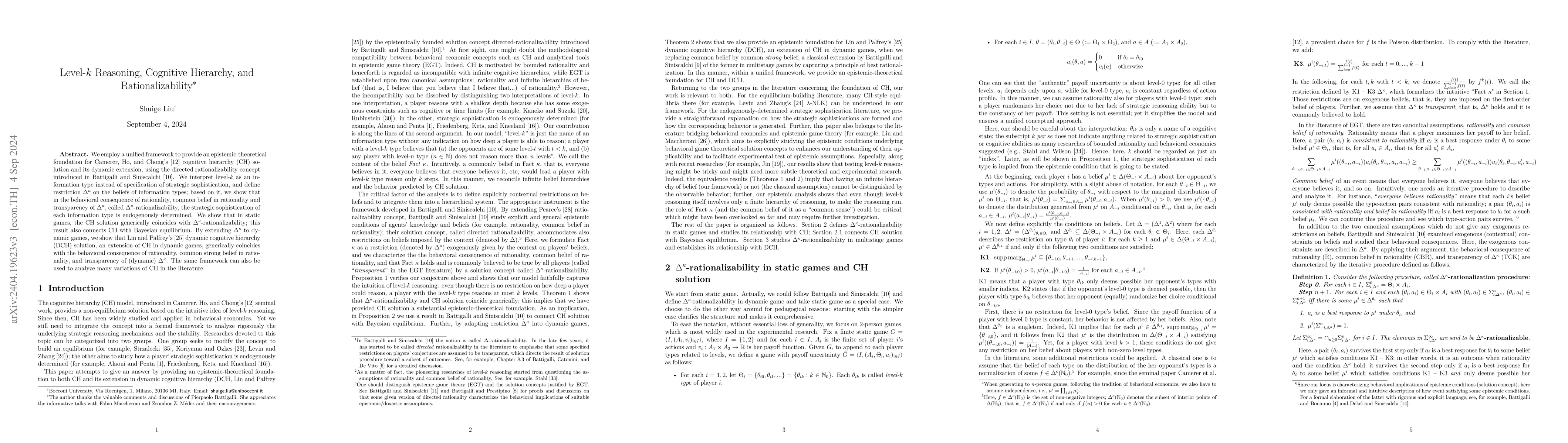 We use a uniform framework to give Camerer, Ho, and Chong's (2004) cognitive hierarchy (CH) solution and its dynamic extension a decision-theoretical foundation by the epistemic game theoretical solution concept $\Delta$-rationalizability (Battigalli and Siniscalchi, 2003). We interpret level-$k$ strategic sophistication as an information type and define restriction $\Delta^\kappa$ on information types; based on it, we show that in the behavioral consequence of rationality, common belief in rationality and transparency, called $\Delta^\kappa$-rationalizability, the levels of reasoning is endogenously determined. We show that in static games, CH solution generically coincides with $\Delta^\kappa$-rationalizability; based on this, we connect CH with Bayesian equilibrium. By adapting $\Delta^\kappa$ into dynamic games, we show that Lin and Palfrey's (2024) DCH solution generically coincides with the behavioral consequence of rationality, common strong belief in rationality, and transparency of (dynamic) $\Delta^\kappa$. The same framework could also be used to analyze many variations of CH in the literature.