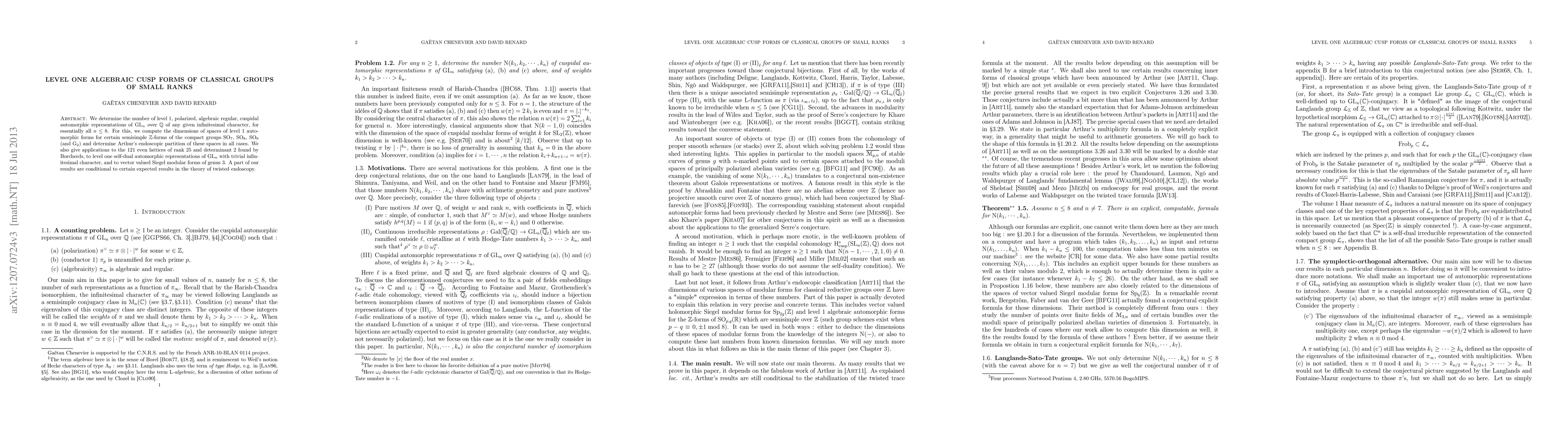 We determine the number of level 1, polarized, algebraic regular, cuspidal automorphic representations of GL_n over Q of any given infinitesimal character, for essentially all n <= 8. For this, we compute the dimensions of spaces of level 1 automorphic forms for certain semisimple Z-forms of the compact groups SO_7, SO_8, SO_9 (and G_2) and determine Arthur's endoscopic partition of these spaces in all cases. We also give applications to the 121 even lattices of rank 25 and determinant 2 found by Borcherds, to level one self-dual automorphic representations of GL_n with trivial infinitesimal character, and to vector valued Siegel modular forms of genus 3. A part of our results are conditional to certain expected results in the theory of twisted endoscopy.
