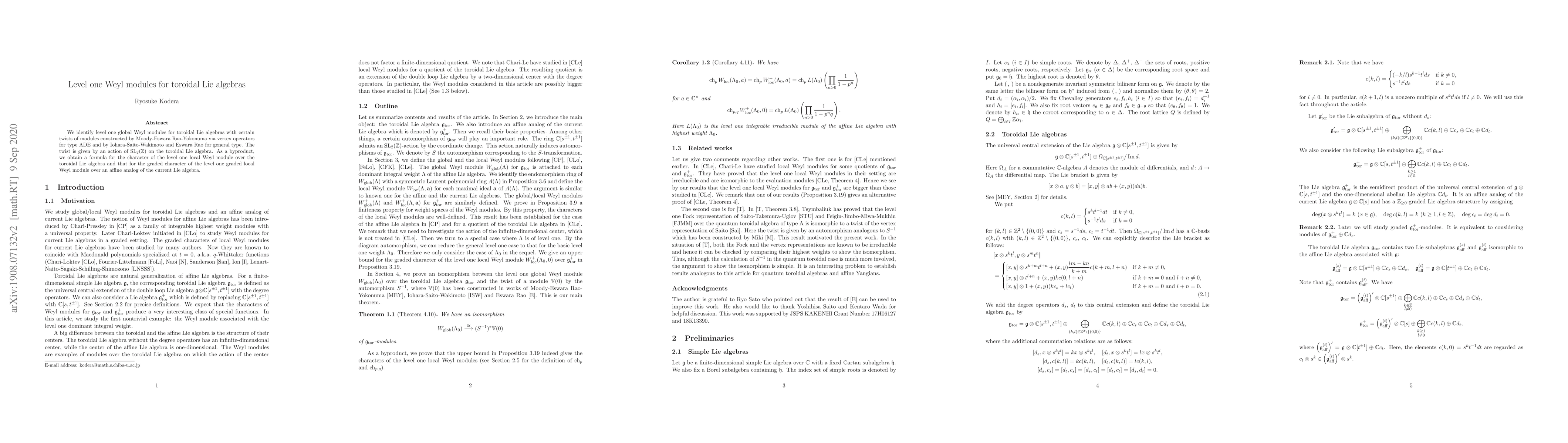 This paper identifies level one global Weyl modules for toroidal Lie algebras through specific twists of modules constructed by Moody-Eswara Rao-Yokonuma and Iohara-Saito-Wakimoto, using vertex operators. It also derives formulas for the character of the level one local Weyl module and the graded character of the level one graded local Weyl module.