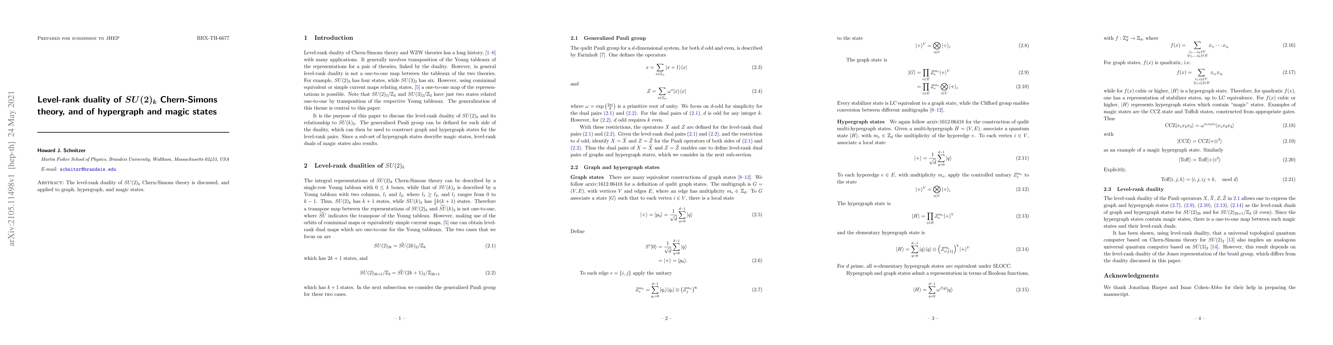 The level-rank duality of SU(2)k Chern-Simons theory is discussed, and applied to graph, hypergraph, and magic states.