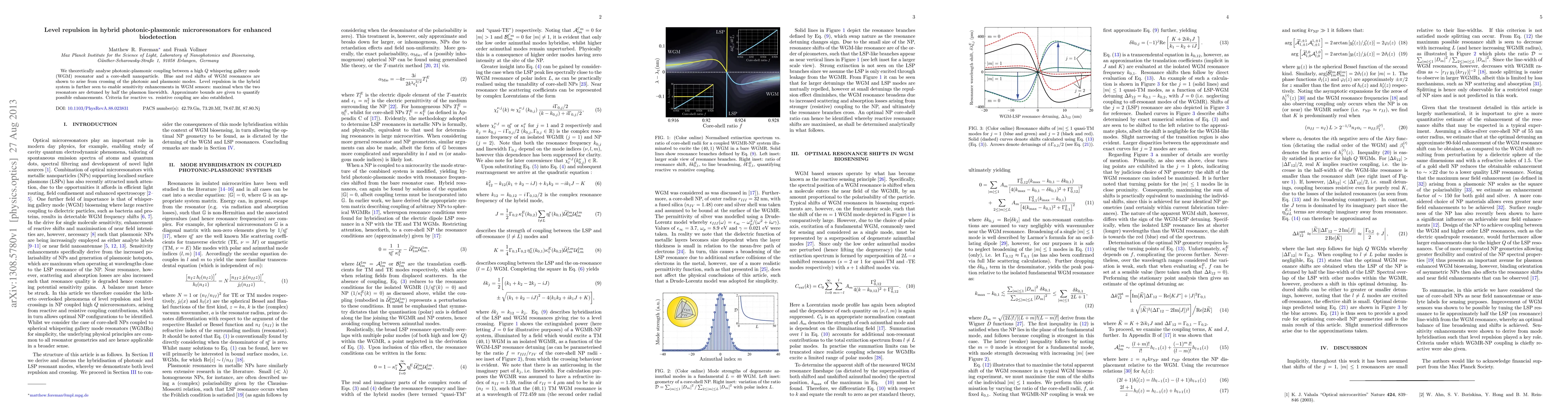 This paper theoretically analyzes the coupling between photonic and plasmonic modes in hybrid microresonators, showing that level repulsion enhances biodetection sensitivity, with maximal enhancement occurring when the resonators are detuned by half the plasmon linewidth. Criteria for determining reactive versus resistive coupling are also provided.