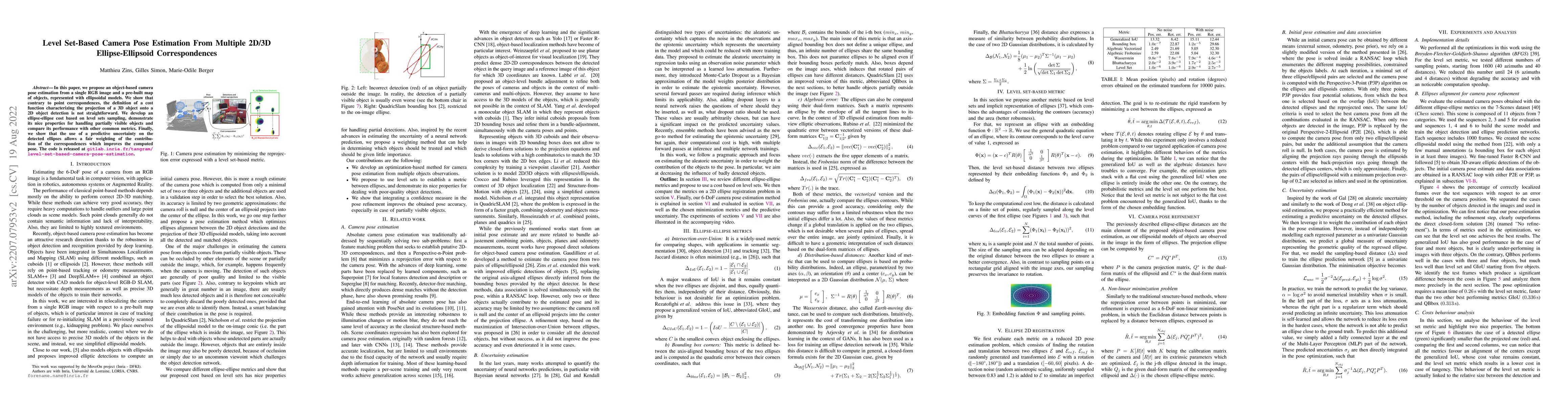 This paper proposes a novel method for camera pose estimation using correspondences between 2D ellipses and 3D ellipsoids, leveraging level set sampling for a cost function. The approach enhances performance by incorporating predictive uncertainty on detected ellipses, improving the accuracy of the computed pose.