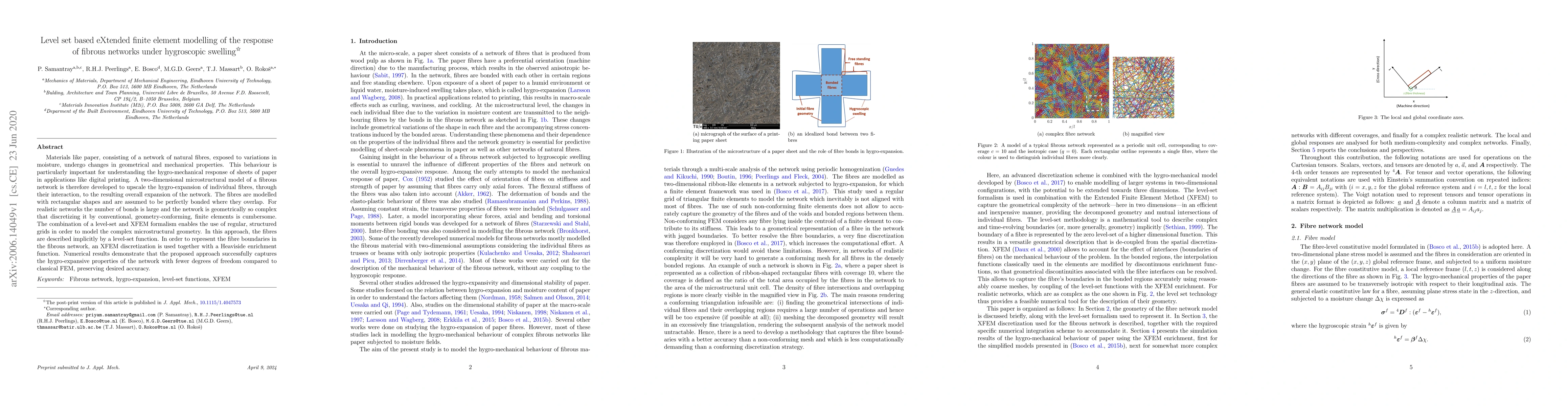 This paper develops a level set-based extended finite element model to simulate the hygro-mechanical response of fibrous networks, like paper, under moisture exposure. The approach uses a combination of level-set and XFEM methods to efficiently model complex microstructures, capturing the hygro-expansion of the network with high accuracy and fewer computational resources than traditional finite element methods.