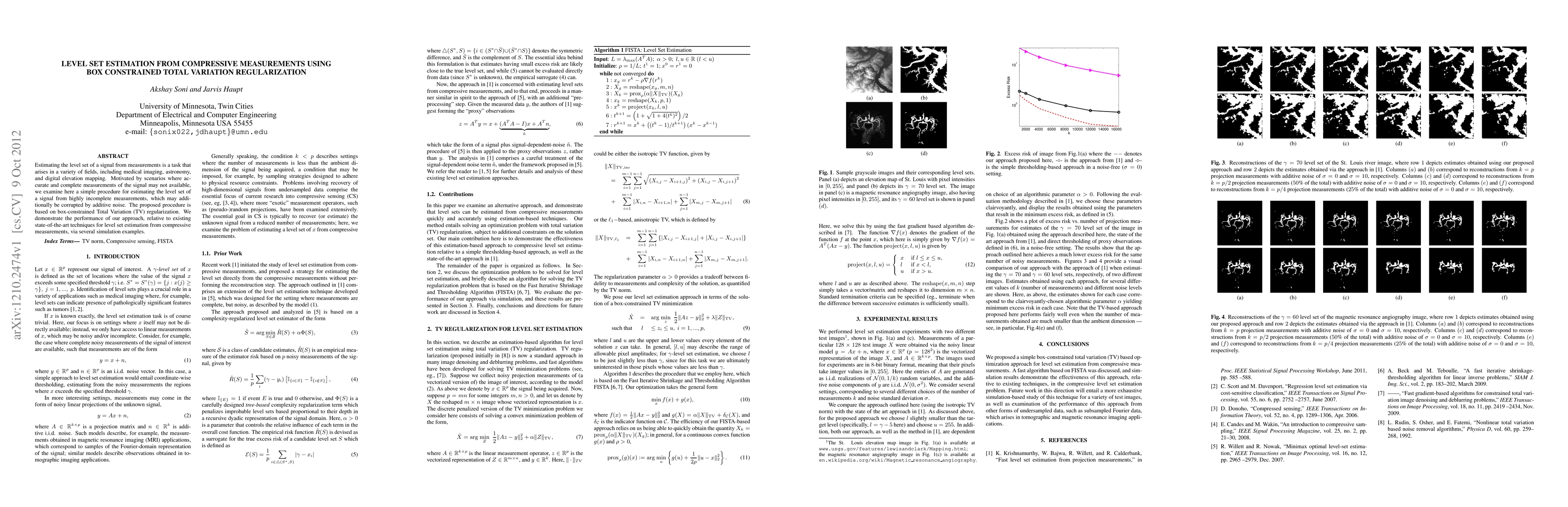 This paper proposes a method for estimating signal level sets from incomplete and noisy compressive measurements using box-constrained Total Variation regularization. The approach is demonstrated to outperform existing techniques through simulation examples in various fields like medical imaging and astronomy.