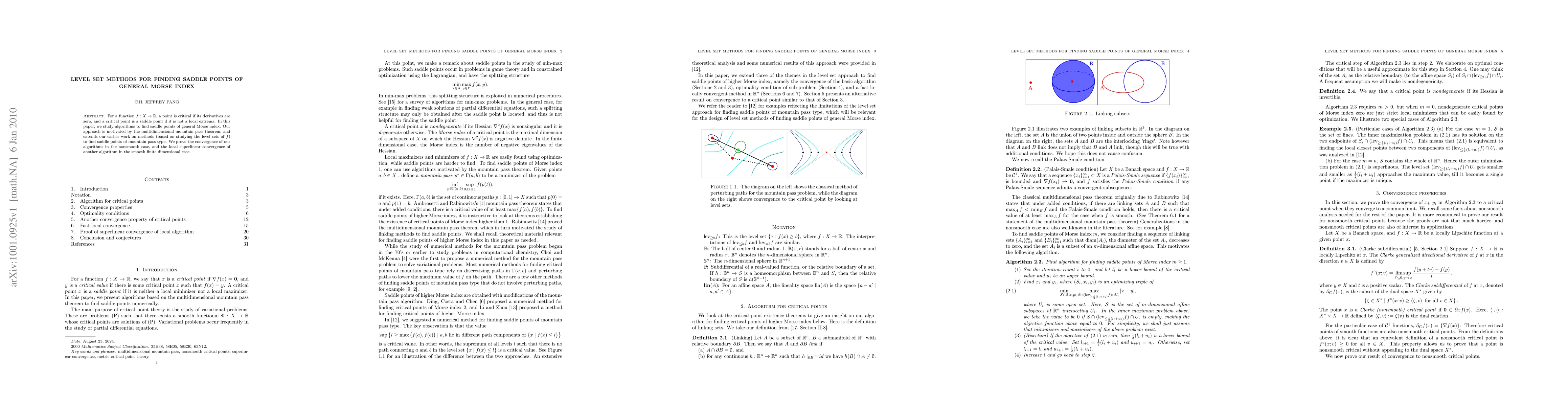 For a real valued function, a point is critical if its derivatives are zero, and a critical point is a saddle point if it is not a local extrema. In this paper, we study algorithms to find saddle points of general Morse index. Our approach is motivated by the multidimensional mountain pass theorem, and extends our earlier work on methods (based on studying the level sets) to find saddle points of mountain pass type. We prove the convergence of our algorithms in the nonsmooth case, and the local superlinear convergence of another algorithm in the smooth finite dimensional case.