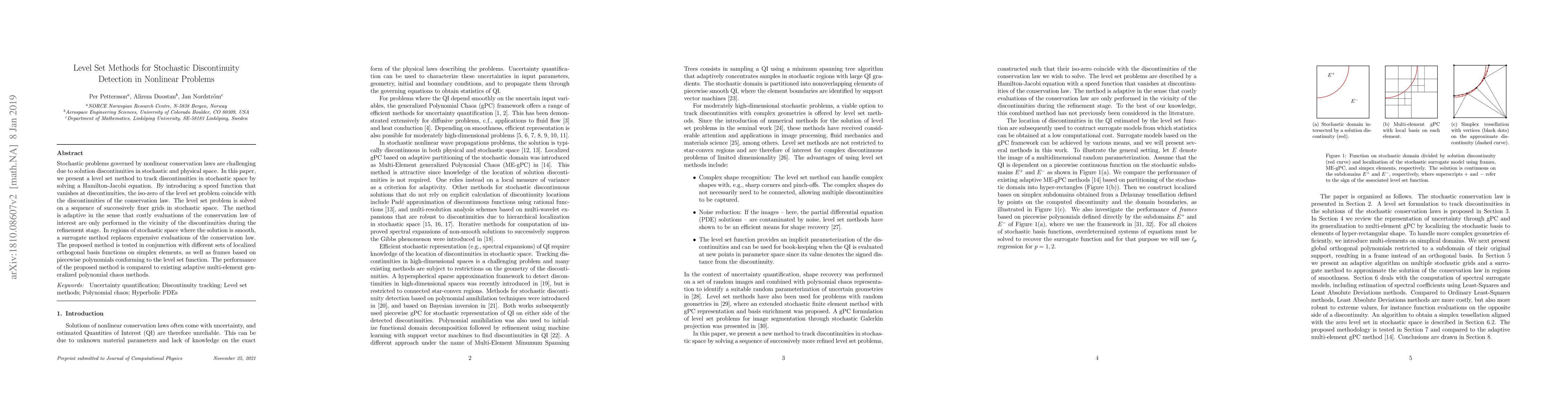 Stochastic physical problems governed by nonlinear conservation laws are challenging due to solution discontinuities in stochastic and physical space. In this paper, we present a level set method to track discontinuities in stochastic space by solving a Hamilton-Jacobi equation. By introducing a speed function that vanishes at discontinuities, the iso-zero of the level set problem coincide with the discontinuities of the conservation law. The level set problem is solved on a sequence of successively finer grids in stochastic space. The method is adaptive in the sense that costly evaluations of the conservation law of interest are only performed in the vicinity of the discontinuities during the refinement stage. In regions of stochastic space where the solution is smooth, a surrogate method replaces expensive evaluations of the conservation law. The proposed method is tested in conjunction with different sets of localized orthogonal basis functions on simplex elements, as well as frames based on piecewise polynomials conforming to the level set function. The performance of the proposed method is compared to existing adaptive multi-element generalized polynomial chaos methods.
