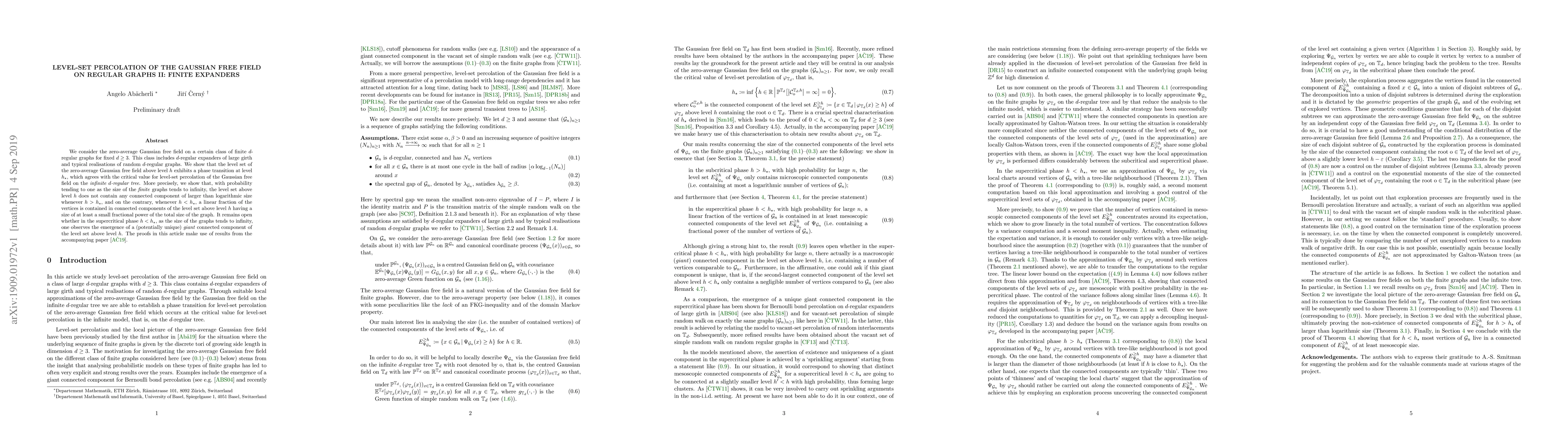 This paper investigates the level-set percolation behavior of the zero-average Gaussian free field on finite $d$-regular expanders and typical random $d$-regular graphs for fixed $d\geq 3$. It demonstrates a phase transition at a critical level $h_\star$, analogous to the infinite $d$-regular tree, where the level set above $h_\star$ lacks large connected components, while below $h_\star$, a significant fraction of vertices belong to sizable connected components.