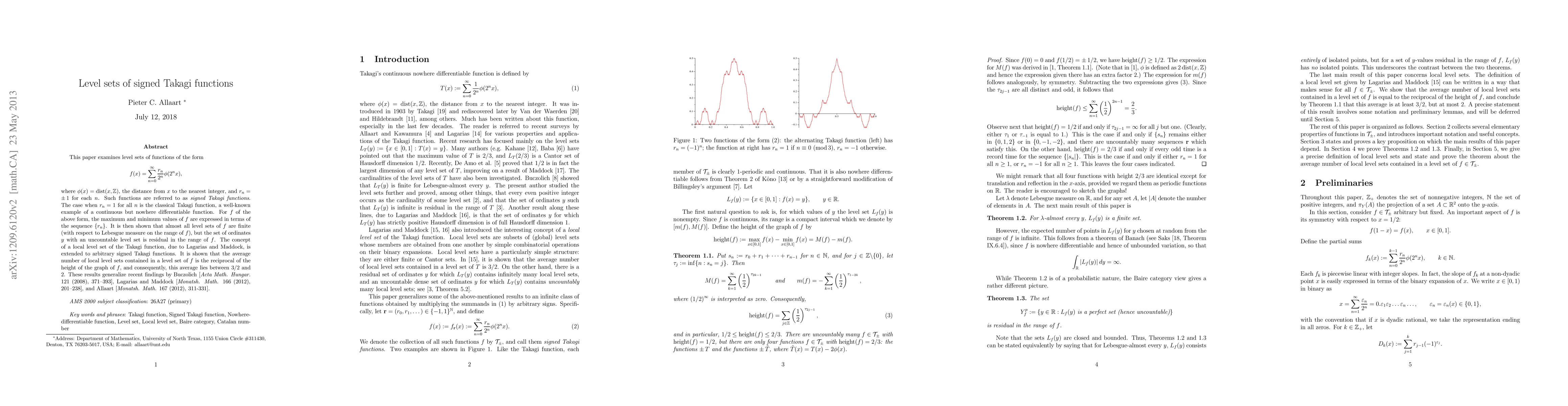 This paper examines level sets of functions of the form $f(x)=\sum_{n=0}^\infty \frac{r_n}{2^n}\phi(2^n x)$, where phi(x) is the distance from x to the nearest integer, and r_n equals 1 or -1 for each n. Such functions are referred to as signed Takagi functions. The case when r_n=1 for all n is the classical Takagi function, a well-known example of a continuous but nowhere differentiable function. For f of the above form, the maximum and minimum values of f are expressed in terms of the sequence {r_n}. It is then shown that almost all level sets of f are finite (with respect to Lebesgue measure on the range of f), but the set of ordinates y with an uncountably large level set is residual in the range of f. The concept of a local level set of the Takagi function, due to Lagarias and Maddock, is extended to arbitrary signed Takagi functions. It is shown that the average number of local level sets contained in a level set of f is the reciprocal of the height of the graph of f, and consequently, this average lies between 3/2 and 2.