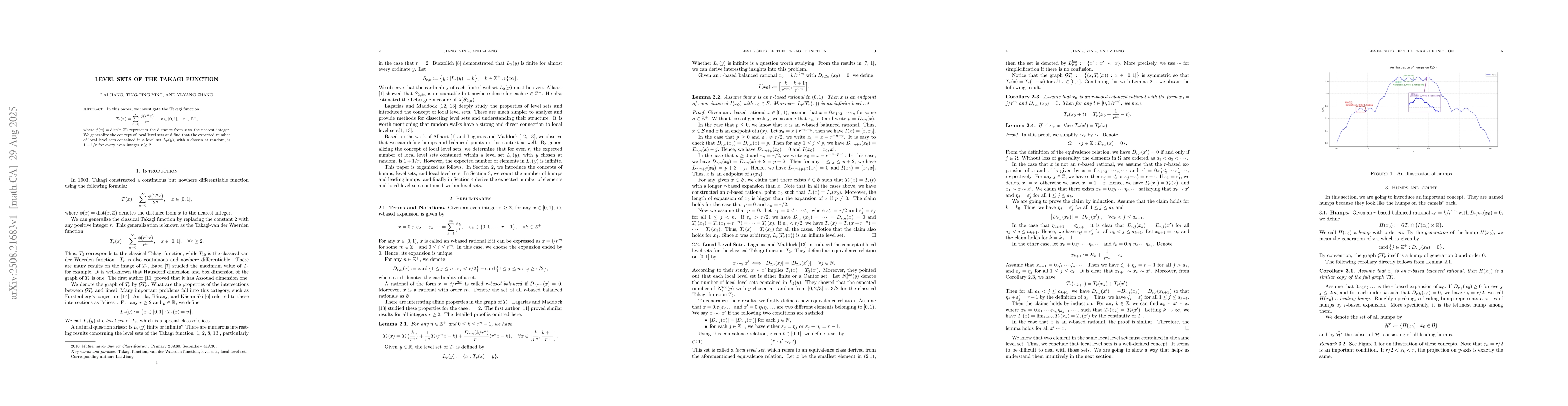 In this paper, we investigate the Takagi function, $$ T_r(x) = \sum_{n=0}^{\infty} \frac{\phi(r^n x)}{r^n} ,\quad x\in [0,1], \quad r \in \mathbb{Z}^+, $$ where $\phi(x)={\rm dist}(x,\mathbb{Z})$ represents the distance from $x$ to the nearest integer. We generalize the concept of local level sets and find that the expected number of local level sets contained in a level set $L_r(y)$, with $y$ chosen at random, is $1 + 1/r$ for every even integer $r \geq 2$.