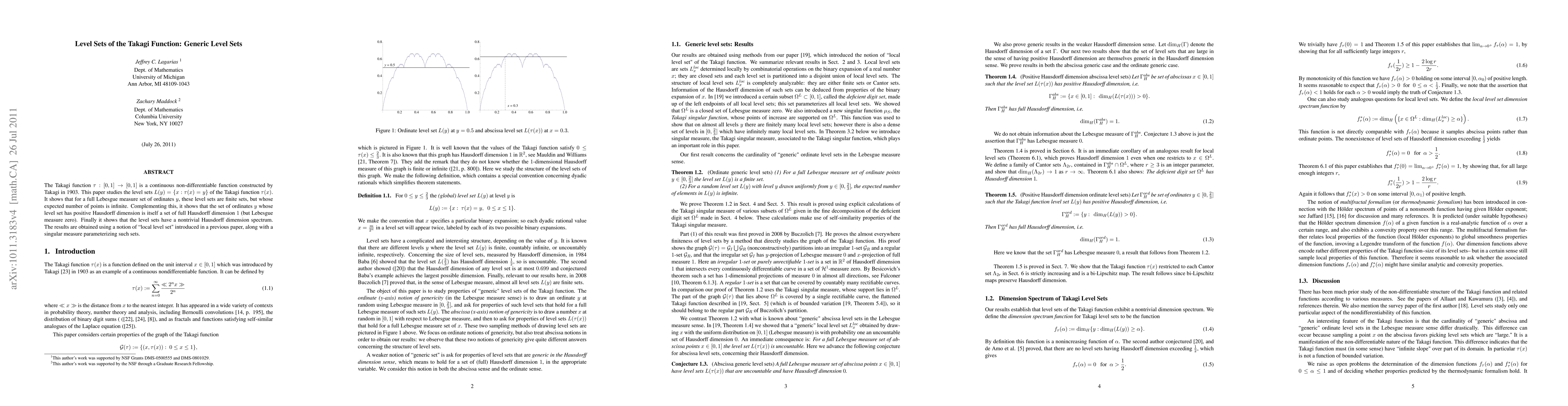 The Takagi function {\tau} : [0, 1] \rightarrow [0, 1] is a continuous non-differentiable function constructed by Takagi in 1903. This paper studies the level sets L(y) = {x : {\tau}(x) = y} of the Takagi function {\tau}(x). It shows that for a full Lebesgue measure set of ordinates y, these level sets are finite sets, but whose expected number of points is infinite. Complementing this, it shows that the set of ordinates y whose level set has positive Hausdorff dimension is itself a set of full Hausdorff dimension 1 (but Lebesgue measure zero). Finally it shows that the level sets have a nontrivial Hausdorff dimension spectrum. The results are obtained using a notion of "local level set" introduced in a previous paper, along with a singular measure parameterizing such sets.