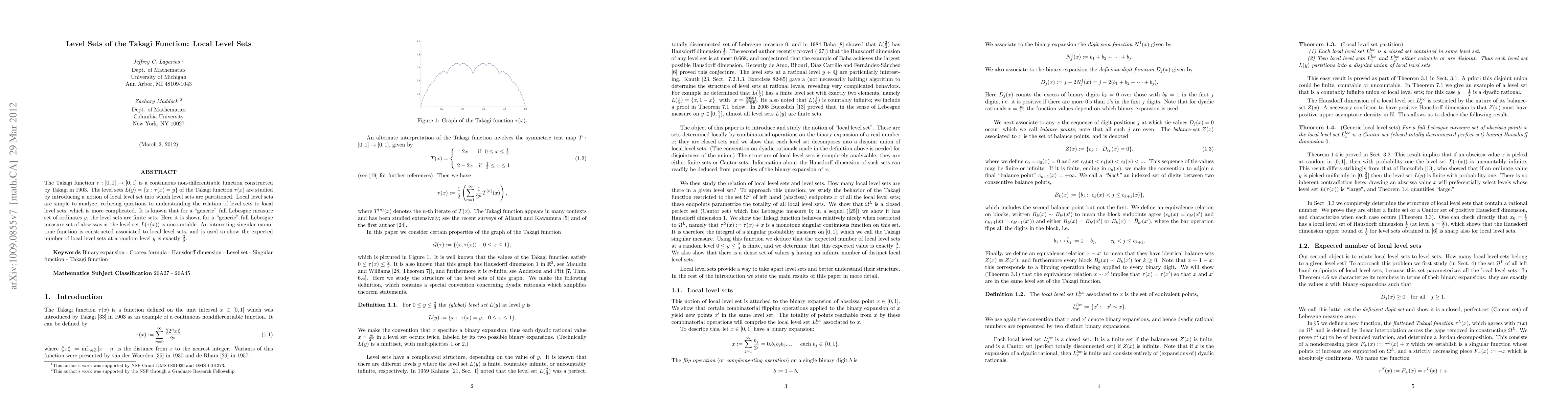 This paper investigates the level sets of the Takagi function, introducing local level sets to simplify analysis. It demonstrates that for a "generic" full Lebesgue measure set of abscissas, the level sets are uncountable, and constructs a singular monotone function to show the expected number of local level sets at a random level is 3/2.