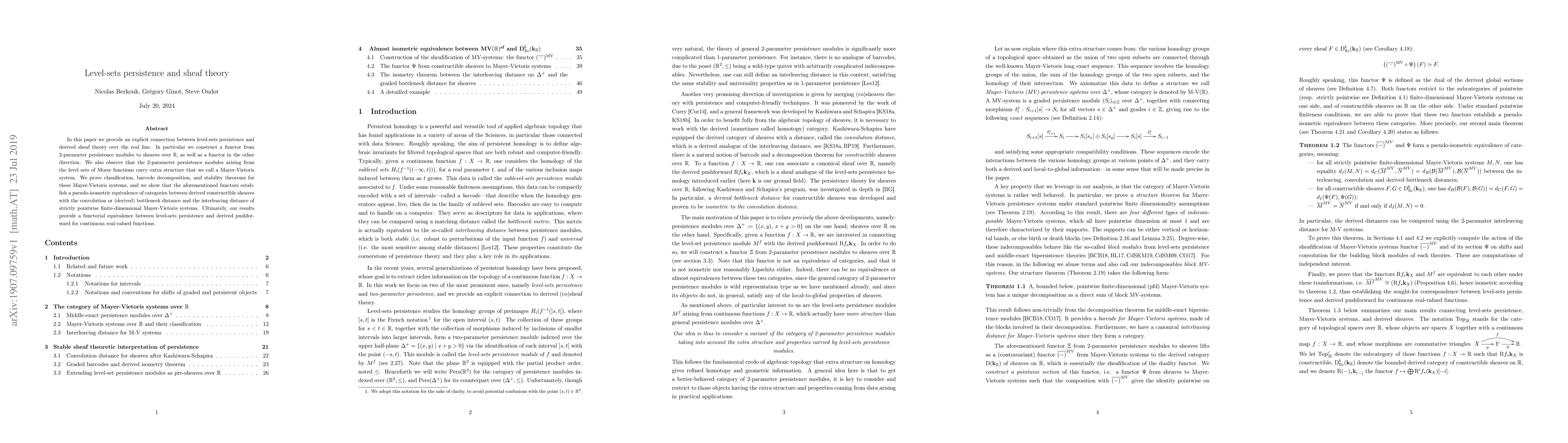 This paper establishes a connection between level-sets persistence and derived sheaf theory, constructing functors between persistence modules and sheaves over the real line. It introduces a Mayer-Vietoris system for 2-parameter persistence modules from Morse functions and proves classification and stability theorems for these systems, ultimately showing a pseudo-isometric equivalence between derived constructible sheaves and Mayer-Vietoris systems.