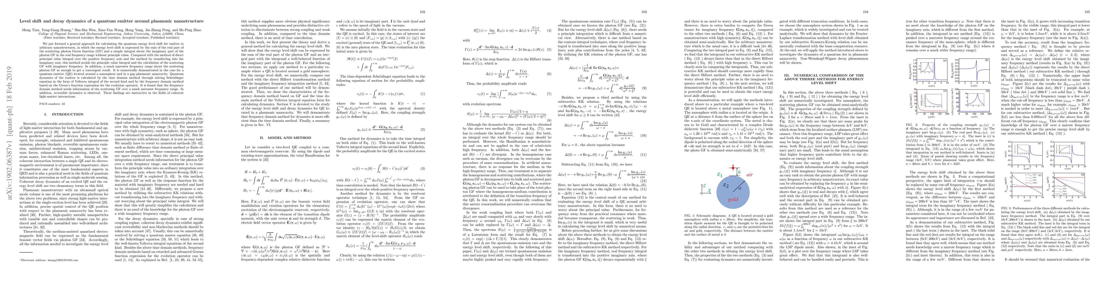This paper presents a novel method for calculating quantum energy level shifts in emitters around plasmonic nanostructures, avoiding complex integrals and providing a more efficient approach. It also investigates the quantum dynamics of emitters using both time and frequency domain methods, revealing reversible dynamics and narrower frequency range requirements.
