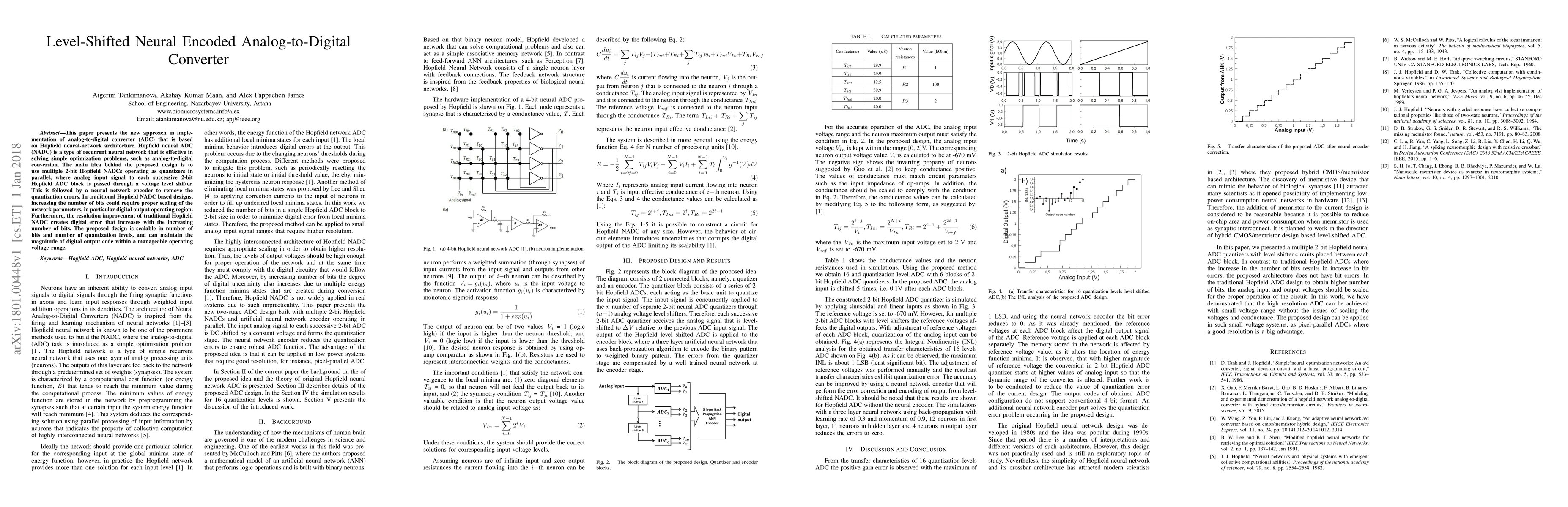 This paper introduces a scalable level-shifted neural encoded analog-to-digital converter (ADC) based on Hopfield neural networks, utilizing multiple 2-bit quantizers and voltage level shifters to enhance resolution while maintaining manageable operating voltages and minimizing quantization errors.