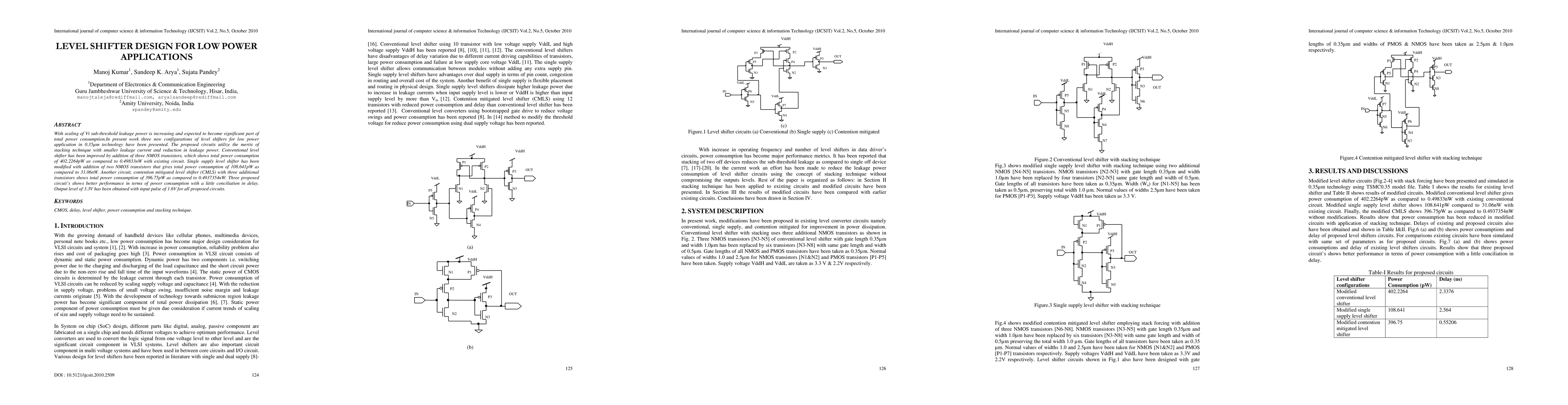 With scaling of Vt sub-threshold leakage power is increasing and expected to become significant part of total power consumption In present work three new configurations of level shifters for low power application in 0.35{\mu}m technology have been presented. The proposed circuits utilize the merits of stacking technique with smaller leakage current and reduction in leakage power. Conventional level shifter has been improved by addition of three NMOS transistors, which shows total power consumption of 402.2264pW as compared to 0.49833nW with existing circuit. Single supply level shifter has been modified with addition of two NMOS transistors that gives total power consumption of 108.641pW as compared to 31.06nW. Another circuit, contention mitigated level shifter (CMLS) with three additional transistors shows total power consumption of 396.75pW as compared to 0.4937354nW. Three proposed circuit's shows better performance in terms of power consumption with a little conciliation in delay. Output level of 3.3V has been obtained with input pulse of 1.6V for all proposed circuits.