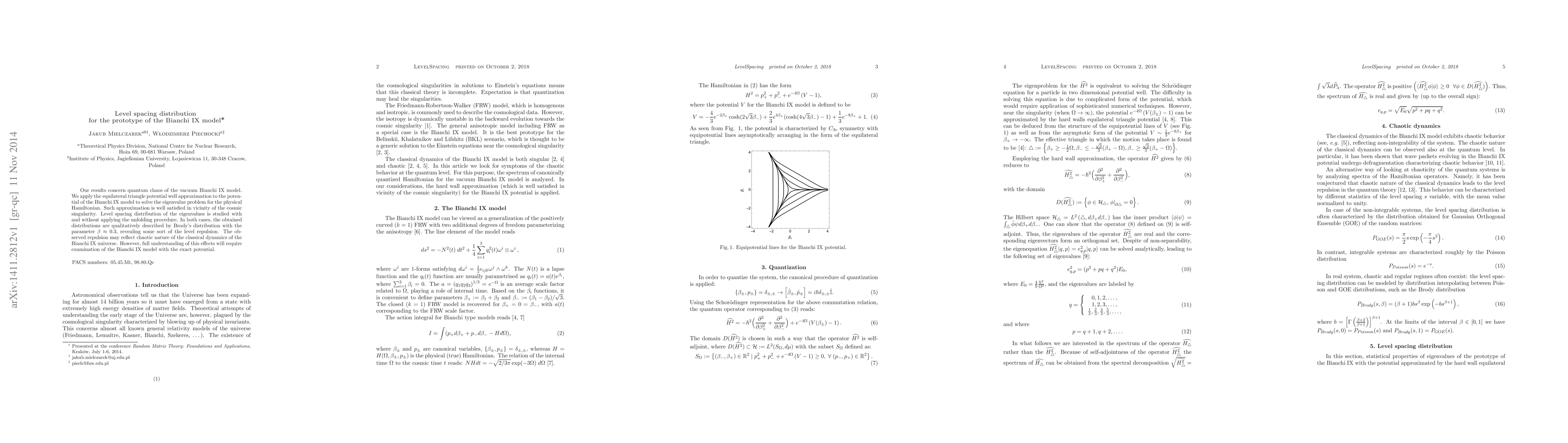 Our results concern quantum chaos of the vacuum Bianchi IX model. We apply the equilateral triangle potential well approximation to the potential of the Bianchi IX model to solve the eigenvalue problem for the physical Hamiltonian. Such approximation is well satisfied in vicinity of the cosmic singularity. Level spacing distribution of the eigenvalues is studied with and without applying the unfolding procedure. In both cases, the obtained distributions are qualitatively described by Brody's distribution with the parameter $\beta\approx0.3$, revealing some sort of the level repulsion. The observed repulsion may reflect chaotic nature of the classical dynamics of the Bianchi IX universe. However, full understanding of this effects will require examination of the Bianchi IX model with the exact potential.