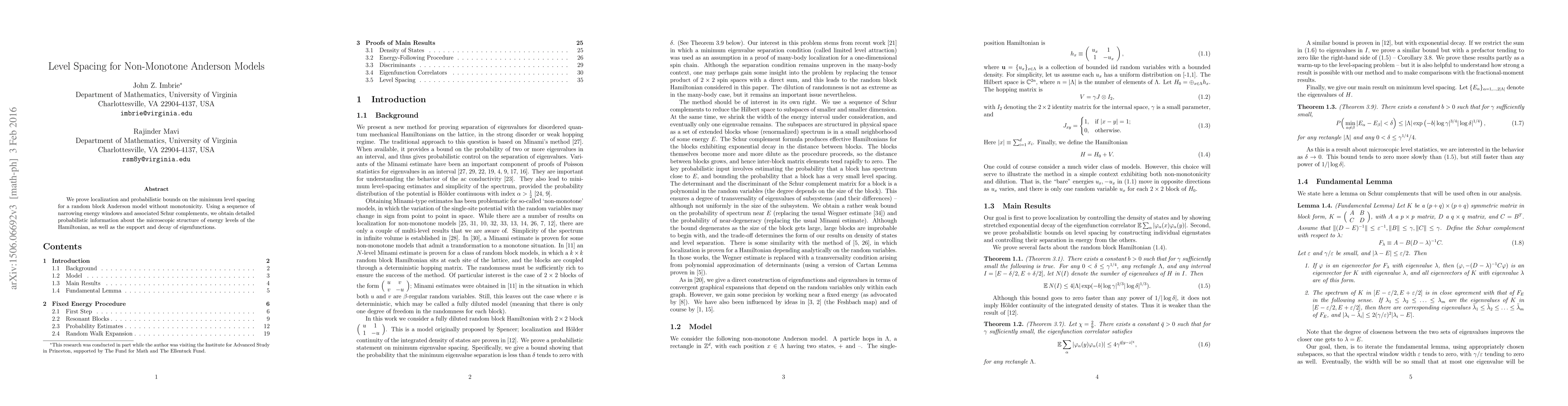 We prove localization and probabilistic bounds on the minimum level spacing for a random block Anderson model without monotonicity. Using a sequence of narrowing energy windows and associated Schur complements, we obtain detailed probabilistic information about the microscopic structure of energy levels of the Hamiltonian, as well as the support and decay of eigenfunctions.
