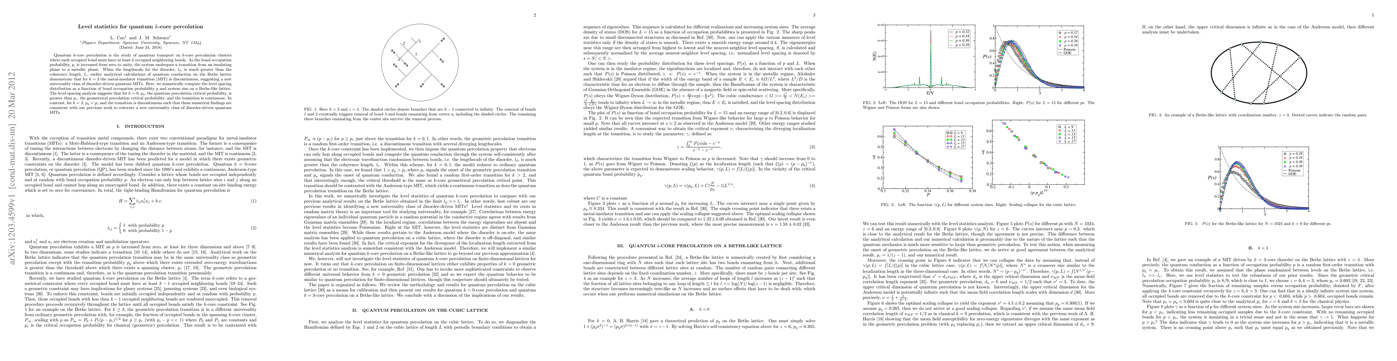 This paper investigates quantum $k$-core percolation on a Bethe-like lattice, finding that the metal-insulator transition is continuous for $k=0$ and discontinuous for $k=3$. Numerical analysis of level spacing distribution supports the existence of a new universality class for disorder-driven quantum transitions.