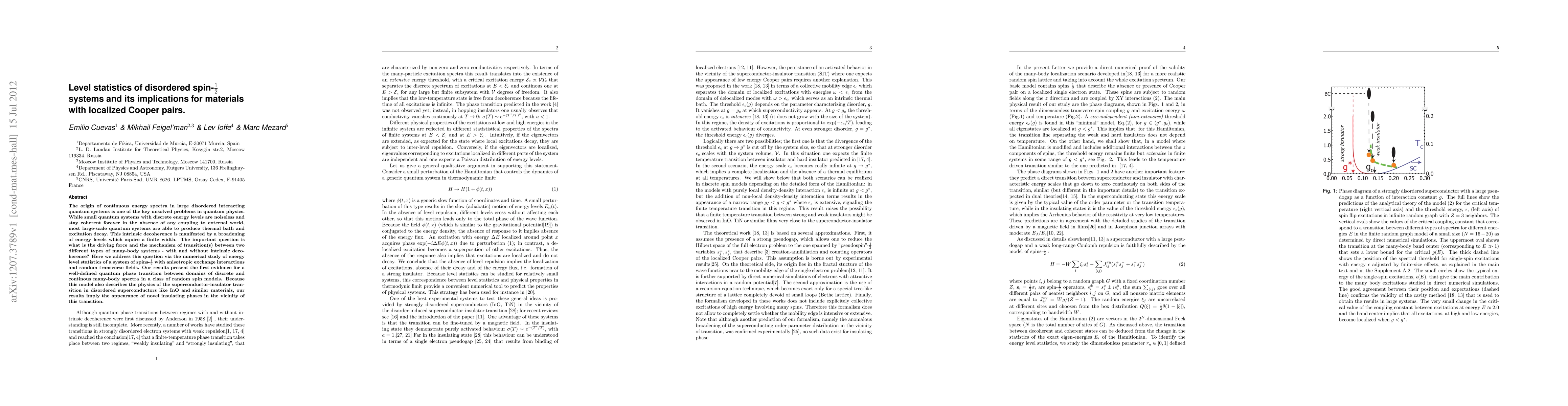 The origin of continuous energy spectra in large disordered interacting quantum systems is one of the key unsolved problems in quantum physics. While small quantum systems with discrete energy levels are noiseless and stay coherent forever in the absence of any coupling to external world, most large-scale quantum systems are able to produce thermal bath and excitation decay. This intrinsic decoherence is manifested by a broadening of energy levels which aquire a finite width. The important question is what is the driving force and the mechanism of transition(s) between two different types of many-body systems - with and without intrinsic decoherence? Here we address this question via the numerical study of energy level statistics of a system of spins-1/2 with anisotropic exchange interactions and random transverse fields. Our results present the first evidence for a well-defined quantum phase transition between domains of discrete and continous many-body spectra in a class of random spin models. Because this model also describes the physics of the superconductor-insulator transition in disordered superconductors like InO and similar materials, our results imply the appearance of novel insulating phases in the vicinity of this transition.