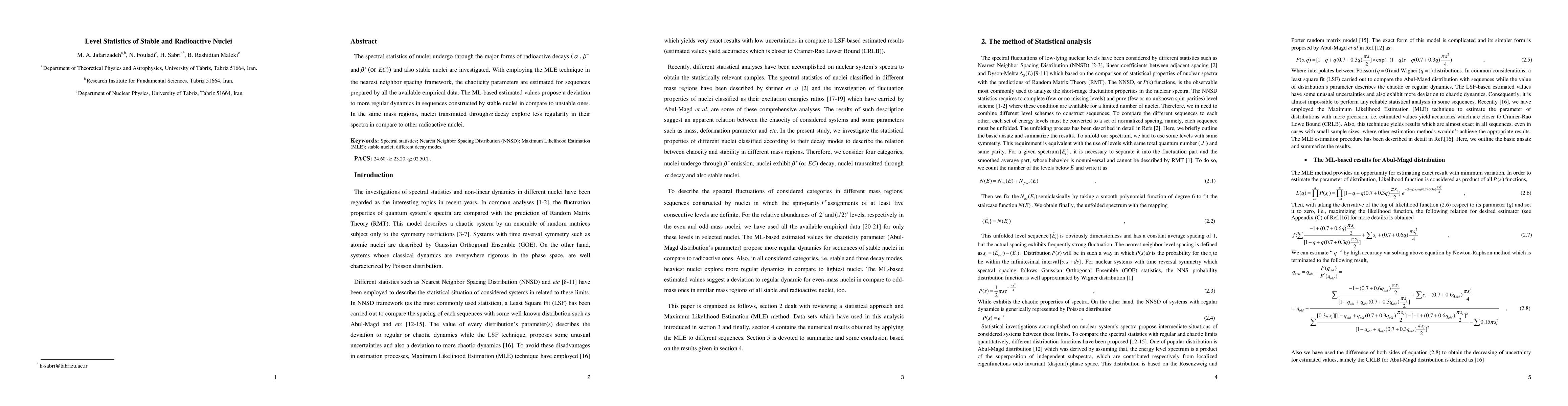 Researchers used a statistical method to analyze the decay patterns of radioactive nuclei and found that stable nuclei exhibit more regular behavior than unstable ones. This suggests that stable nuclei may have different underlying dynamics than those undergoing radioactive decay.