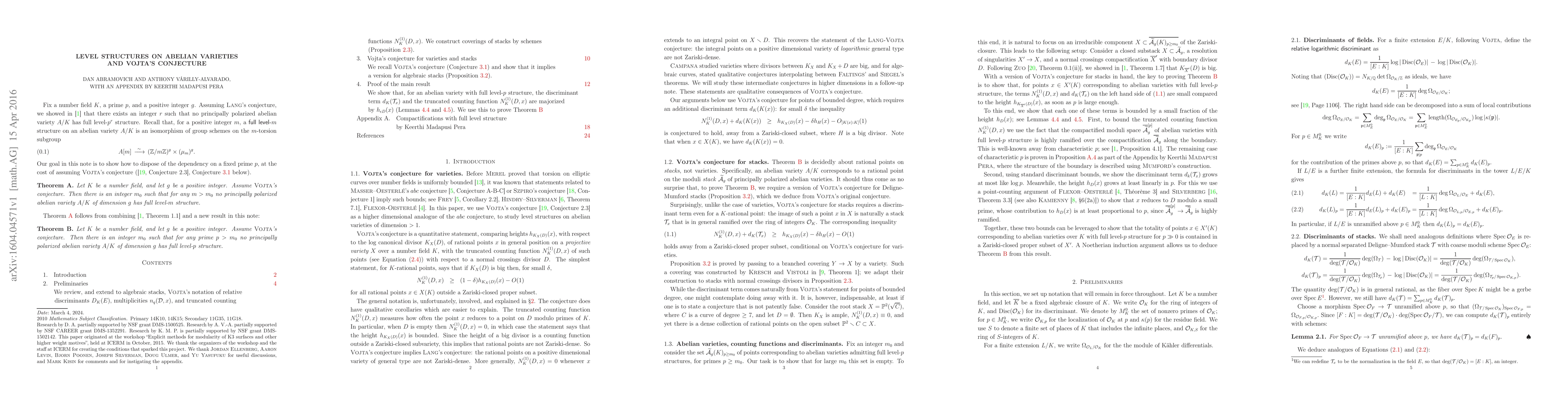 Summary: The paper proves that under Vojta's conjecture, no principally polarized abelian variety over a fixed number field $K$ of dimension $g$ can have a full level-$m$ structure for sufficiently large $m$, by extending Vojta's conjecture to Deligne-Mumford stacks.