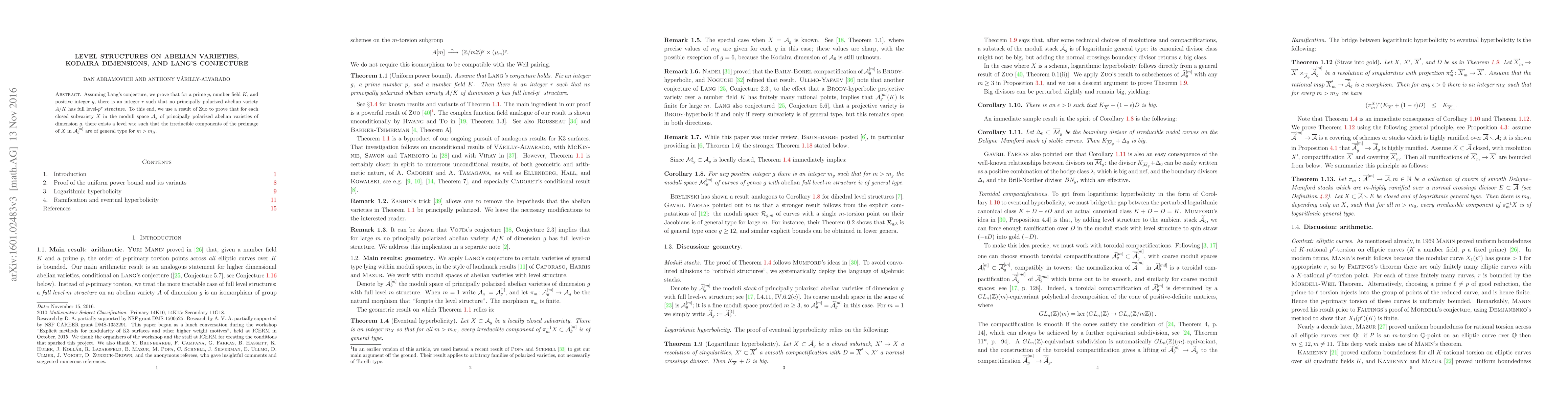 Researchers prove that under Lang's conjecture, no principally polarized abelian variety of dimension g has full level structure for sufficiently large integers r. They use a result from Zuo to show that for some level m_X, the preimage of any closed subvariety in the moduli space has irreducible components of general type.