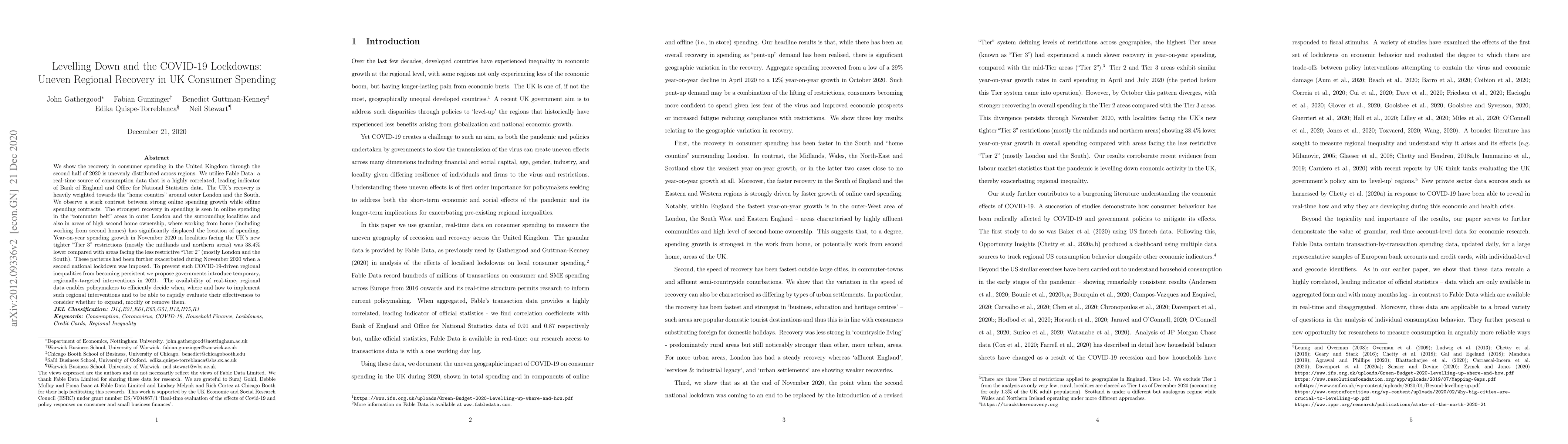 We show the recovery in consumer spending in the United Kingdom through the second half of 2020 is unevenly distributed across regions. We utilise Fable Data: a real-time source of consumption data that is a highly correlated, leading indicator of Bank of England and Office for National Statistics data. The UK's recovery is heavily weighted towards the "home counties" around outer London and the South. We observe a stark contrast between strong online spending growth while offline spending contracts. The strongest recovery in spending is seen in online spending in the "commuter belt" areas in outer London and the surrounding localities and also in areas of high second home ownership, where working from home (including working from second homes) has significantly displaced the location of spending. Year-on-year spending growth in November 2020 in localities facing the UK's new tighter "Tier 3" restrictions (mostly the midlands and northern areas) was 38.4% lower compared with areas facing the less restrictive "Tier 2" (mostly London and the South). These patterns had been further exacerbated during November 2020 when a second national lockdown was imposed. To prevent such COVID-19-driven regional inequalities from becoming persistent we propose governments introduce temporary, regionally-targeted interventions in 2021. The availability of real-time, regional data enables policymakers to efficiently decide when, where and how to implement such regional interventions and to be able to rapidly evaluate their effectiveness to consider whether to expand, modify or remove them.