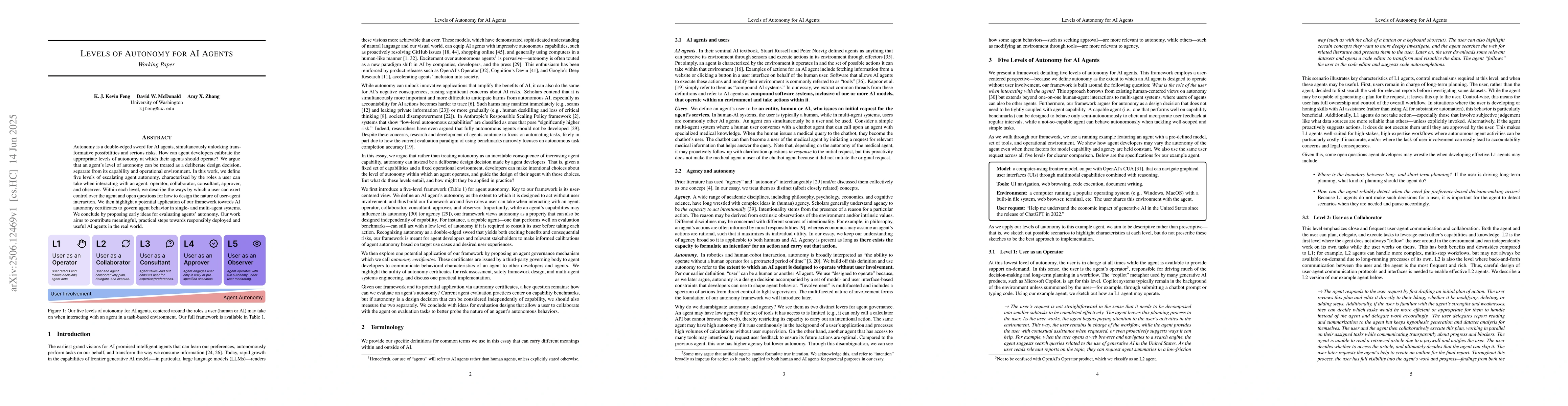 The paper introduces a framework for five levels of autonomy for AI agents, defined by user roles: operator, collaborator, consultant, approver, and observer. It proposes autonomy certificates as a governance mechanism and discusses user-assisted evaluation methods.