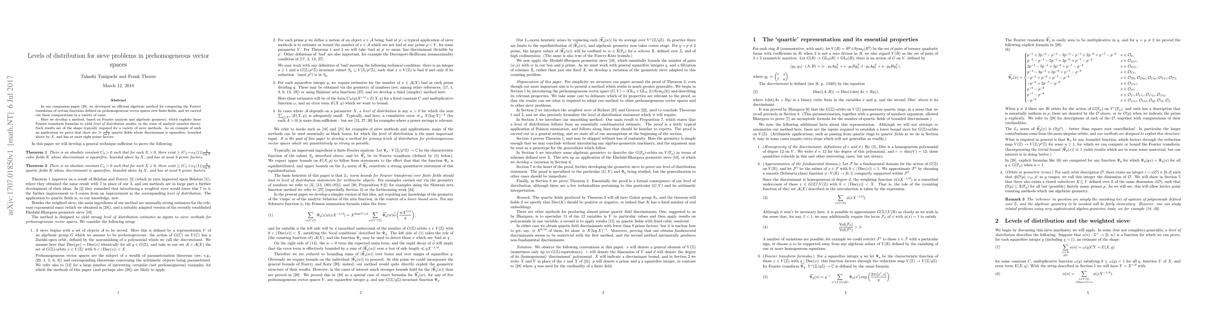 In a companion paper, we developed an efficient algebraic method for computing the Fourier transforms of certain functions defined on prehomogeneous vector spaces over finite fields, and we carried out these computations in a variety of cases. Here we develop a method, based on Fourier analysis and algebraic geometry, which exploits these Fourier transform formulas to yield level of distribution results, in the sense of analytic number theory. Such results are of the shape typically required for a variety of sieve methods. As an example of such an application we prove that there are $\gg$ X/log(X) quartic fields whose discriminant is squarefree, bounded above by X, and has at most eight prime factors.