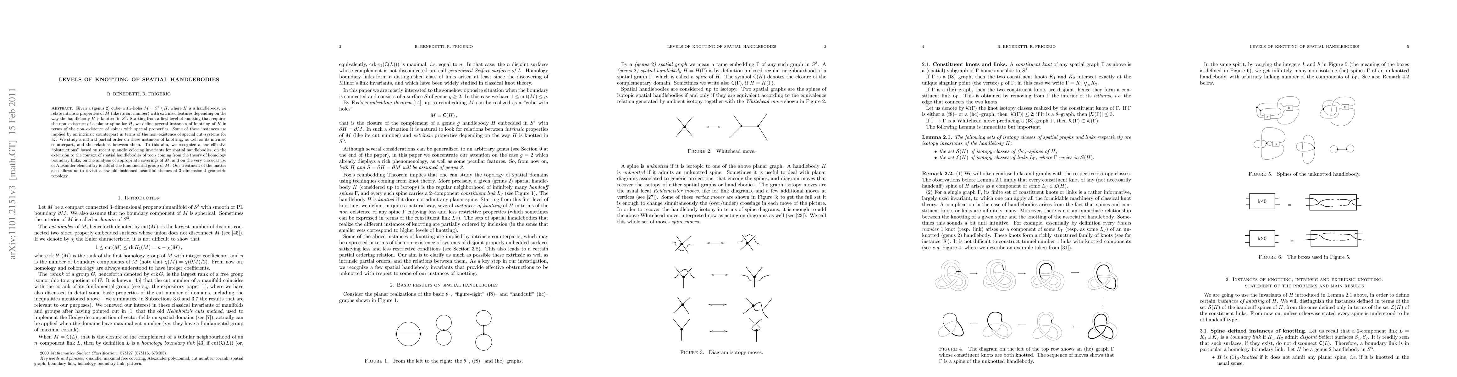 Given a (genus 2) cube-with-holes M, i.e. the complement in S^3 of a handlebody H, we relate intrinsic properties of M (like its cut number) with extrinsic features depending on the way the handlebody H is knotted in S^3. Starting from a first level of knotting that requires the non-existence of a planar spine for H, we define several instances of knotting of H in terms of the non-existence of spines with special properties. Some of these instances are implied by an intrinsic counterpart in terms of the non-existence of special cut-systems for M. We study a natural partial order on these instances of knotting, as well as its intrinsic counterpart, and the relations between them. To this aim, we recognize a few effective "obstructions" based on recent quandle-coloring invariants for spatial handlebodies, on the extension to the context of spatial handlebodies of tools coming from the theory of homology boundary links, on the analysis of appropriate coverings of M, and on the very classical use of Alexander elementary ideals of the fundamental group of M. Our treatment of the matter also allows us to revisit a few old-fashioned beautiful themes of 3-dimensional geometric topology.