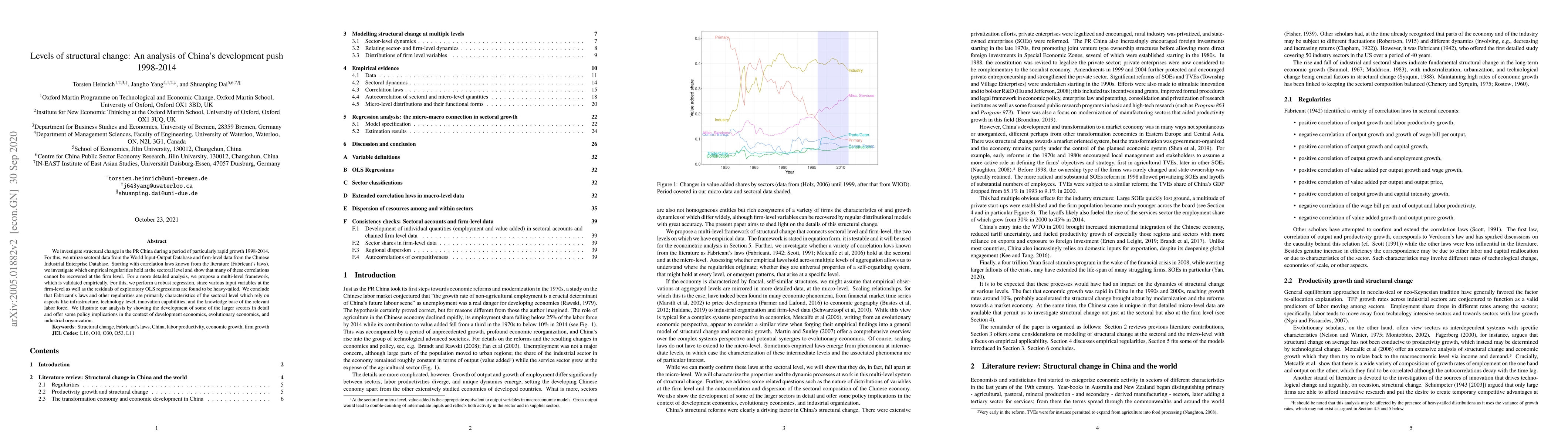We investigate structural change in the PR China during a period of particularly rapid growth 1998-2014. For this, we utilize sectoral data from the World Input-Output Database and firm-level data from the Chinese Industrial Enterprise Database. Starting with correlation laws known from the literature (Fabricant's laws), we investigate which empirical regularities hold at the sectoral level and show that many of these correlations cannot be recovered at the firm level. For a more detailed analysis, we propose a multi-level framework, which is validated with empirically. For this, we perform a robust regression, since various input variables at the firm-level as well as the residuals of exploratory OLS regressions are found to be heavy-tailed. We conclude that Fabricant's laws and other regularities are primarily characteristics of the sectoral level which rely on aspects like infrastructure, technology level, innovation capabilities, and the knowledge base of the relevant labor force. We illustrate our analysis by showing the development of some of the larger sectors in detail and offer some policy implications in the context of development economics, evolutionary economics, and industrial organization.