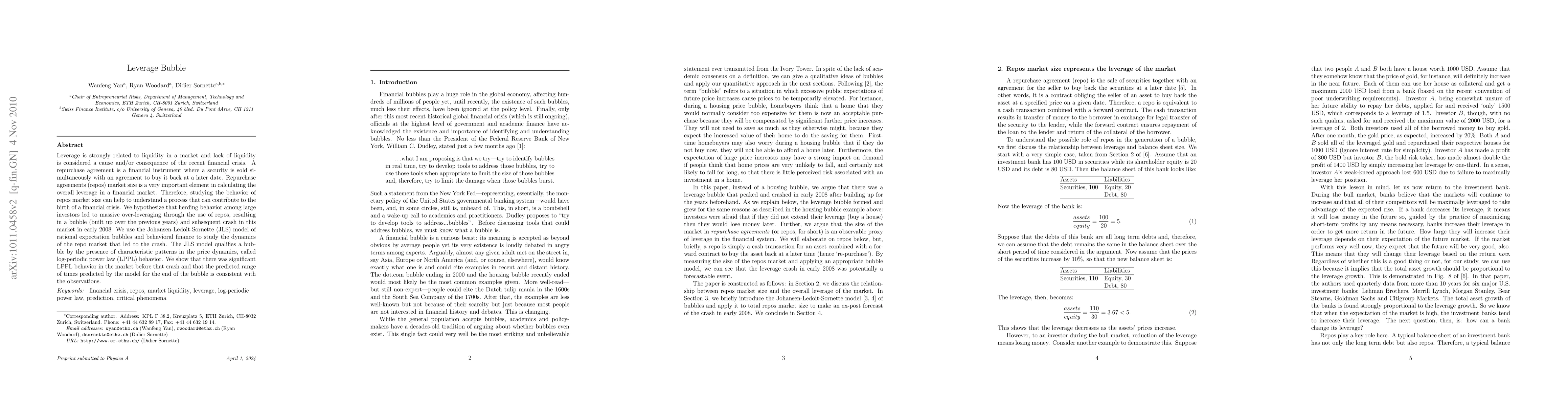 Researchers studied the repo market leading up to the 2008 financial crisis, finding evidence of a bubble built on herding behavior among large investors using repurchase agreements. The study used a model of rational expectation bubbles and behavioral finance to analyze price dynamics and predict the end of the bubble.