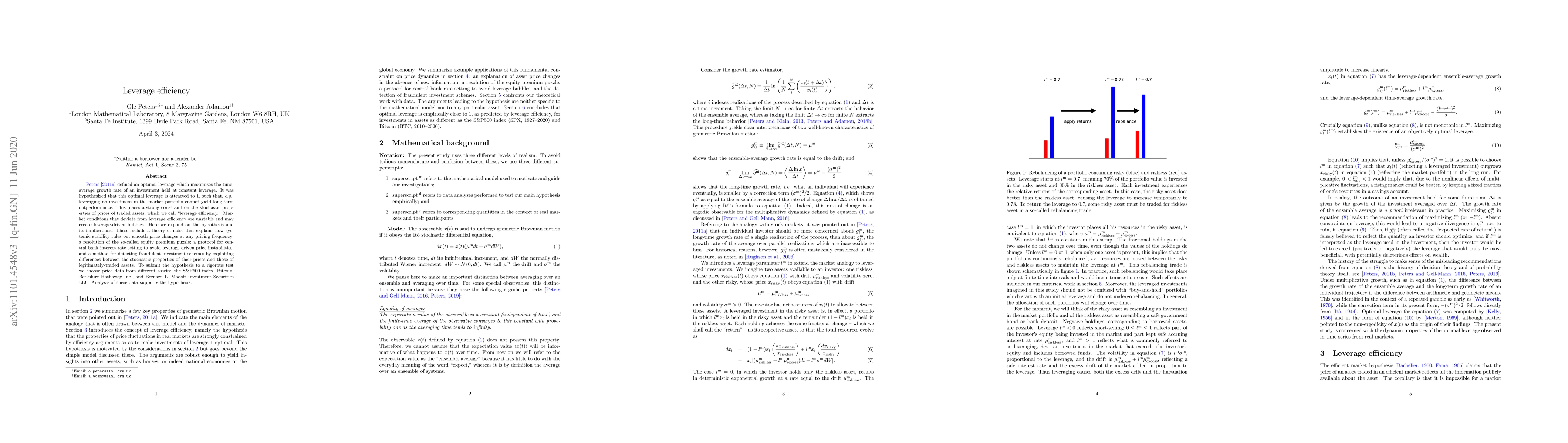 Peters (2011a) defined an optimal leverage which maximizes the time-average growth rate of an investment held at constant leverage. It was hypothesized that this optimal leverage is attracted to 1, such that, e.g., leveraging an investment in the market portfolio cannot yield long-term outperformance. This places a strong constraint on the stochastic properties of prices of traded assets, which we call "leverage efficiency." Market conditions that deviate from leverage efficiency are unstable and may create leverage-driven bubbles. Here we expand on the hypothesis and its implications. These include a theory of noise that explains how systemic stability rules out smooth price changes at any pricing frequency; a resolution of the so-called equity premium puzzle; a protocol for central bank interest rate setting to avoid leverage-driven price instabilities; and a method for detecting fraudulent investment schemes by exploiting differences between the stochastic properties of their prices and those of legitimately-traded assets. To submit the hypothesis to a rigorous test we choose price data from different assets: the S&P500 index, Bitcoin, Berkshire Hathaway Inc., and Bernard L. Madoff Investment Securities LLC. Analysis of these data supports the hypothesis.