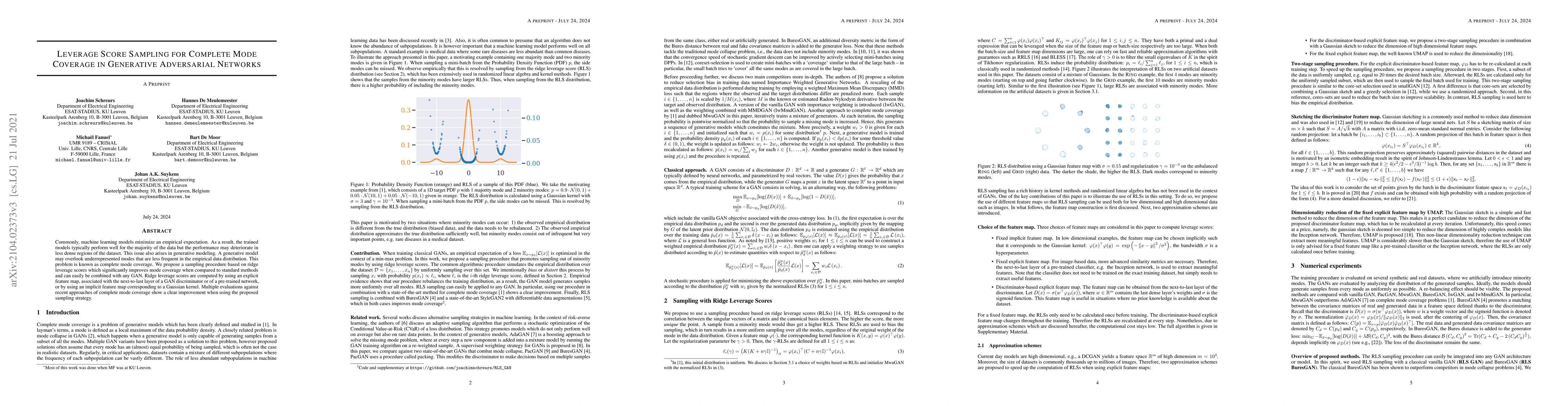 Commonly, machine learning models minimize an empirical expectation. As a result, the trained models typically perform well for the majority of the data but the performance may deteriorate in less dense regions of the dataset. This issue also arises in generative modeling. A generative model may overlook underrepresented modes that are less frequent in the empirical data distribution. This problem is known as complete mode coverage. We propose a sampling procedure based on ridge leverage scores which significantly improves mode coverage when compared to standard methods and can easily be combined with any GAN. Ridge leverage scores are computed by using an explicit feature map, associated with the next-to-last layer of a GAN discriminator or of a pre-trained network, or by using an implicit feature map corresponding to a Gaussian kernel. Multiple evaluations against recent approaches of complete mode coverage show a clear improvement when using the proposed sampling strategy.