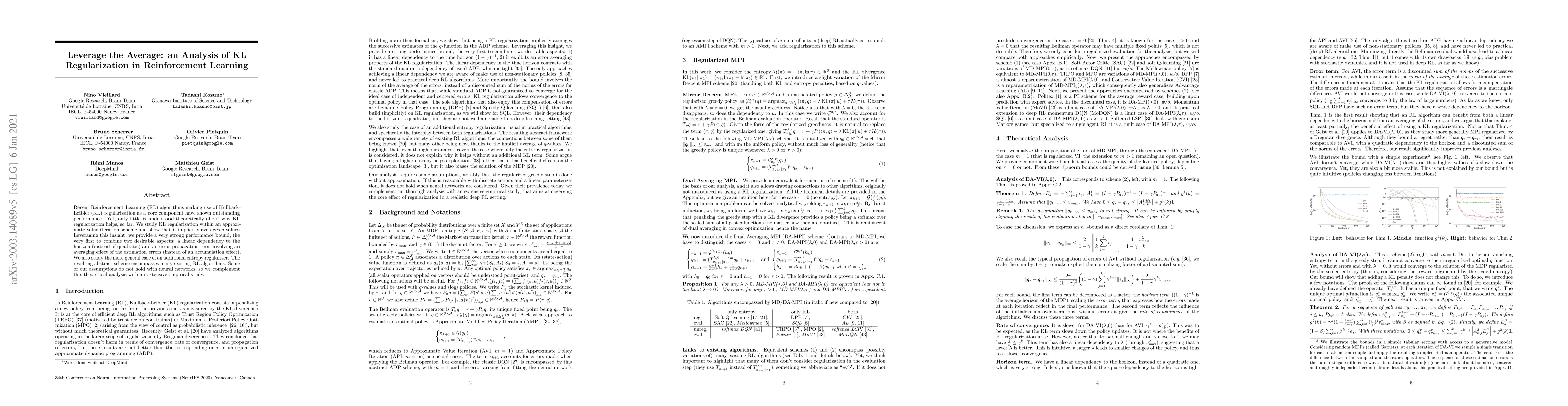 Recent Reinforcement Learning (RL) algorithms making use of Kullback-Leibler (KL) regularization as a core component have shown outstanding performance. Yet, only little is understood theoretically about why KL regularization helps, so far. We study KL regularization within an approximate value iteration scheme and show that it implicitly averages q-values. Leveraging this insight, we provide a very strong performance bound, the very first to combine two desirable aspects: a linear dependency to the horizon (instead of quadratic) and an error propagation term involving an averaging effect of the estimation errors (instead of an accumulation effect). We also study the more general case of an additional entropy regularizer. The resulting abstract scheme encompasses many existing RL algorithms. Some of our assumptions do not hold with neural networks, so we complement this theoretical analysis with an extensive empirical study.