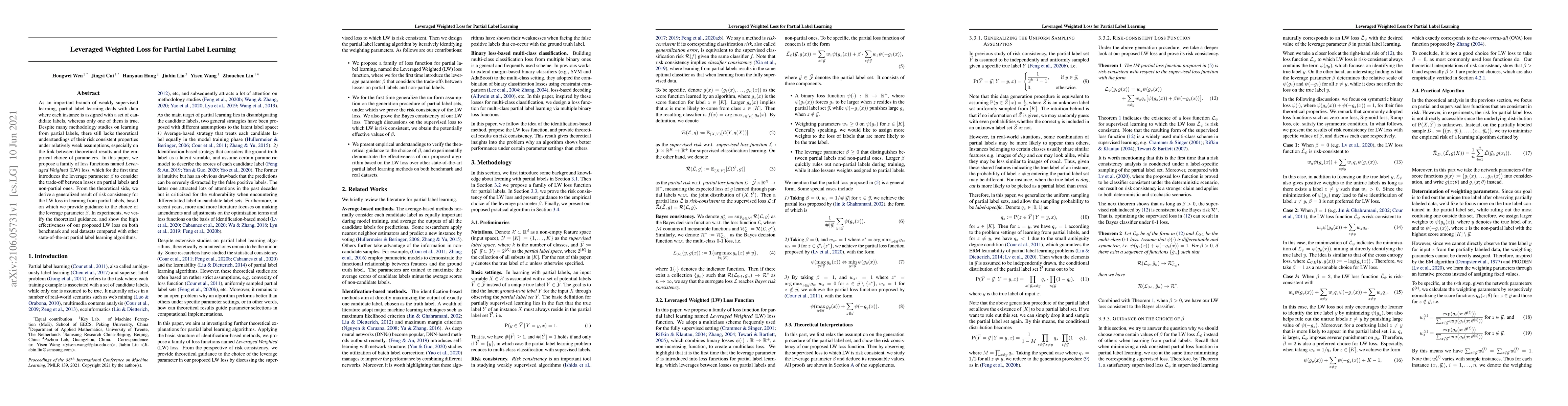 This paper introduces the Leveraged Weighted (LW) loss function for partial label learning, a weakly supervised learning approach dealing with instances having sets of candidate labels, only one of which is correct. The LW loss incorporates a leverage parameter u201cetau201d to balance losses from partial and non-partial labels. Theoretical risk consistency results are derived for the LW loss, guiding the choice of u201cetau201d. Experiments confirm the effectiveness of the proposed LW loss over existing algorithms on benchmark and real datasets.