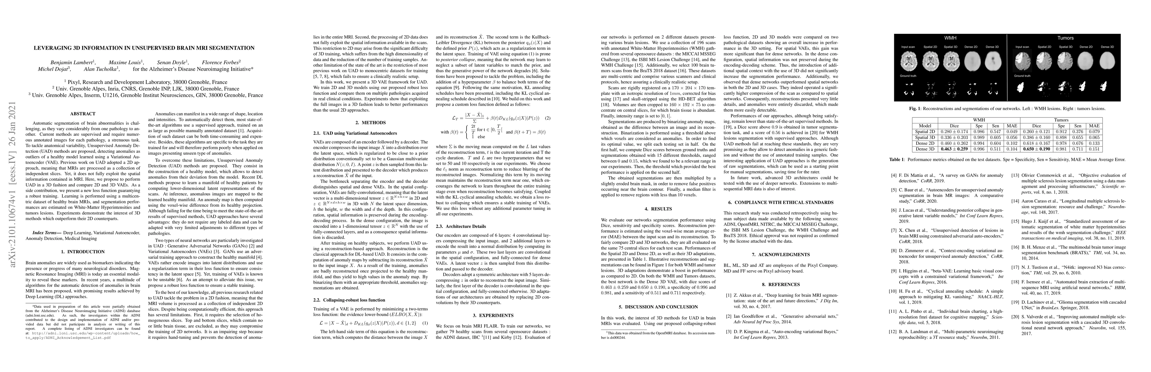 This paper proposes an unsupervised anomaly detection method for brain MRI segmentation using a 3D Variational Autoencoder, which outperforms 2D methods by better leveraging spatial information. The study introduces a new loss function for robust training and demonstrates superior performance on White-Matter Hyperintensities and tumor lesions.