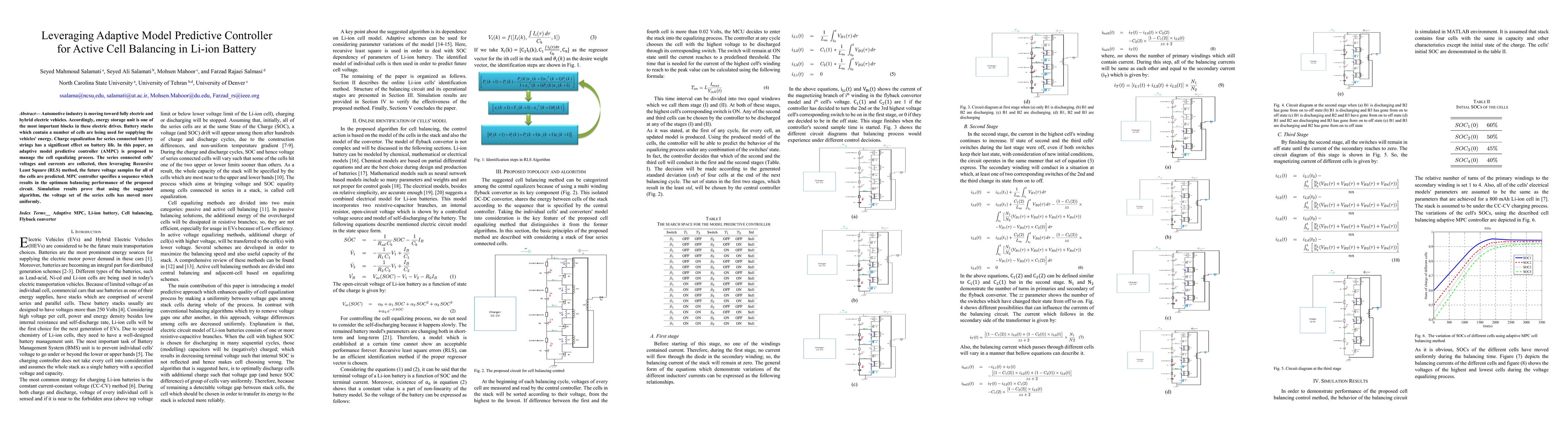 Automotive industry is moving toward fully electric and hybrid electric vehicles. Accordingly, energy storage unit is one of the most important blocks in these electric drives. Battery stacks which contain a number of cells are being used for supplying the vehicles' energy. Charge equalization for series connected battery strings has a significant effect on battery life. In this paper, an adaptive model predictive controller (AMPC) is proposed to manage the cell equalizing process. The series connected cells' voltages and currents are collected, then leveraging Recursive Least Square (RLS) method, the future voltage samples for all of the cells are predicted. MPC controller specifies a sequence which results in the optimum balancing performance of the proposed circuit. Simulation results prove that using the suggested algorithm, the voltage set of the series cells has moved more uniformly.
