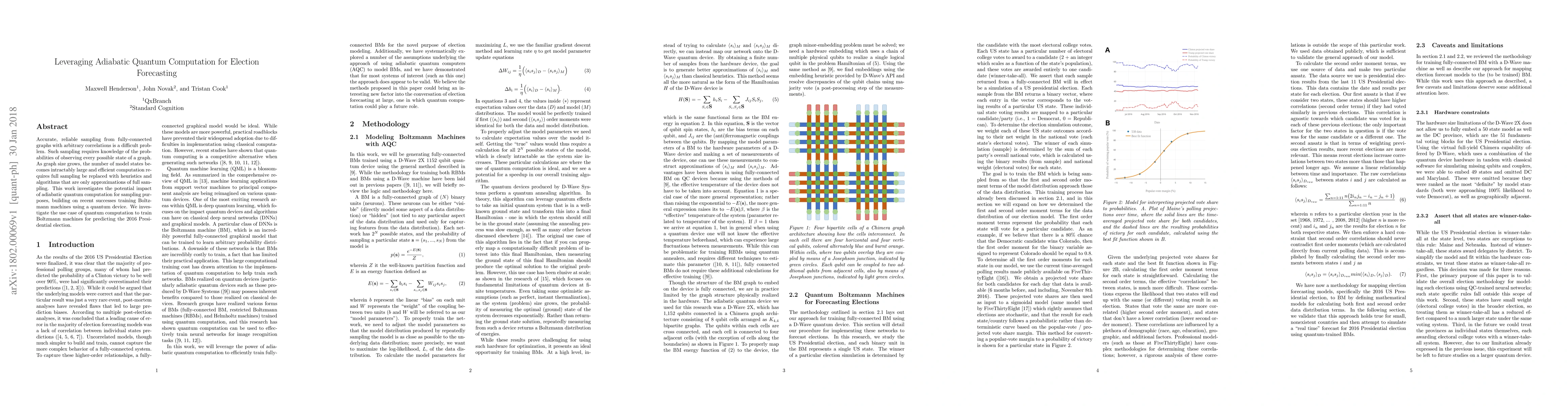 Researchers explore using adiabatic quantum computation to train Boltzmann machines for predicting election outcomes, offering a potential solution for sampling large graphs with arbitrary correlations.