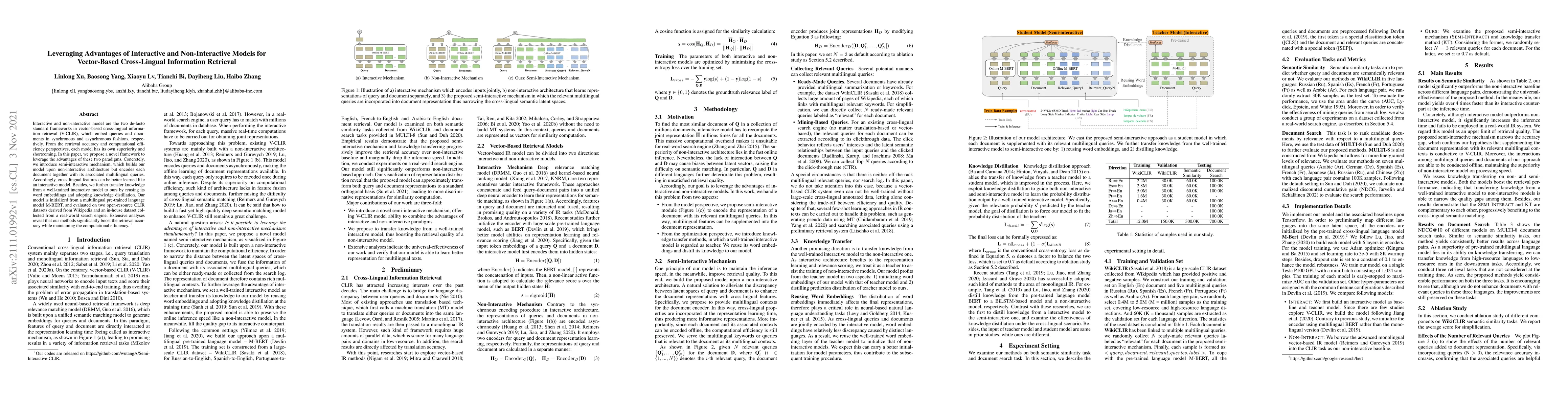 Interactive and non-interactive model are the two de-facto standard frameworks in vector-based cross-lingual information retrieval (V-CLIR), which embed queries and documents in synchronous and asynchronous fashions, respectively. From the retrieval accuracy and computational efficiency perspectives, each model has its own superiority and shortcoming. In this paper, we propose a novel framework to leverage the advantages of these two paradigms. Concretely, we introduce semi-interactive mechanism, which builds our model upon non-interactive architecture but encodes each document together with its associated multilingual queries. Accordingly, cross-lingual features can be better learned like an interactive model. Besides, we further transfer knowledge from a well-trained interactive model to ours by reusing its word embeddings and adopting knowledge distillation. Our model is initialized from a multilingual pre-trained language model M-BERT, and evaluated on two open-resource CLIR datasets derived from Wikipedia and an in-house dataset collected from a real-world search engine. Extensive analyses reveal that our methods significantly boost the retrieval accuracy while maintaining the computational efficiency.