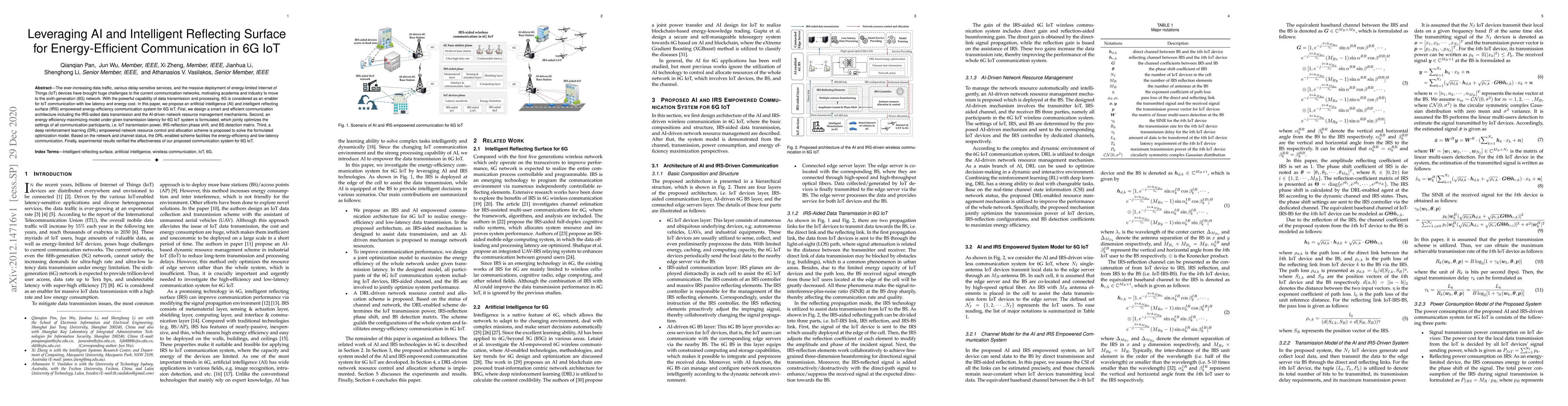 This paper proposes an AI and intelligent reflecting surface (IRS) empowered energy-efficient communication system for 6G IoT, optimizing IoT transmission power, IRS phase shifts, and base station detection matrices to maximize energy efficiency while maintaining low latency. The system utilizes deep reinforcement learning for adaptive resource management.