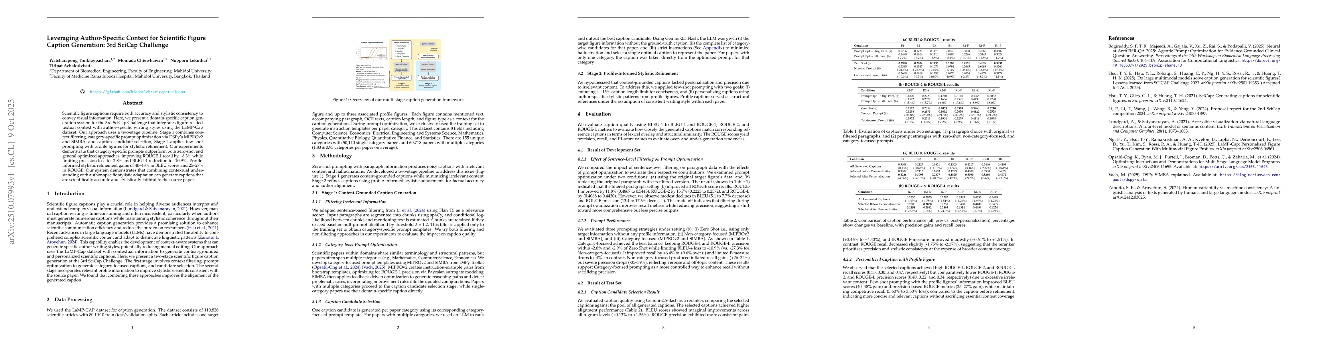 Scientific figure captions require both accuracy and stylistic consistency to convey visual information. Here, we present a domain-specific caption generation system for the 3rd SciCap Challenge that integrates figure-related textual context with author-specific writing styles using the LaMP-Cap dataset. Our approach uses a two-stage pipeline: Stage 1 combines context filtering, category-specific prompt optimization via DSPy's MIPROv2 and SIMBA, and caption candidate selection; Stage 2 applies few-shot prompting with profile figures for stylistic refinement. Our experiments demonstrate that category-specific prompts outperform both zero-shot and general optimized approaches, improving ROUGE-1 recall by +8.3\% while limiting precision loss to -2.8\% and BLEU-4 reduction to -10.9\%. Profile-informed stylistic refinement yields 40--48\% gains in BLEU scores and 25--27\% in ROUGE. Overall, our system demonstrates that combining contextual understanding with author-specific stylistic adaptation can generate captions that are both scientifically accurate and stylistically faithful to the source paper.