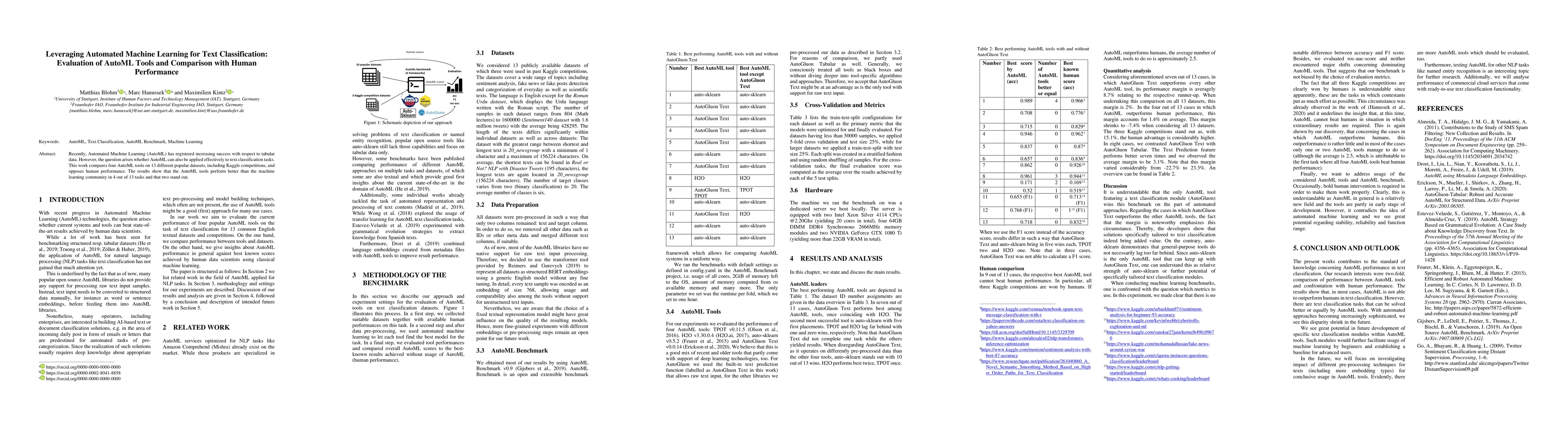 Summary: This study evaluates the effectiveness of four AutoML tools for text classification across 13 datasets, comparing their performance against human experts. The findings indicate that two AutoML tools outperform human performance in four out of the 13 tasks.