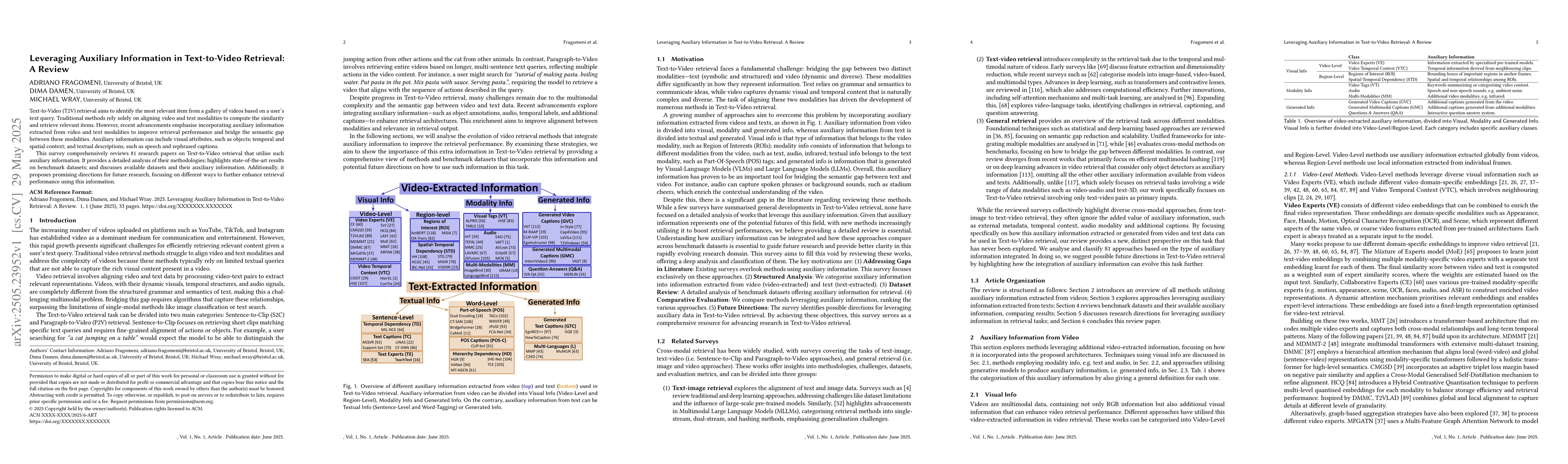 The paper conducts a comprehensive review of 81 research papers on Text-to-Video retrieval, analyzing their methodologies and use of auxiliary information such as visual attributes, temporal and spatial context, and textual descriptions.
